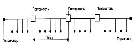 Например, технология Ethernet на тонком коаксиальном кабеле позволяет использовать кабель длиной не более 185 метров, к которому можно подключить не более 30 компьютеров. Однако, если компьютеры интенсивно обмениваются информацией между собой, иногда приходится снижать число подключенных к кабелю компьютеров до 20, а то и до 10, чтобы каждому компьютеру доставалась приемлемая доля общей пропускной способности сети. Для снятия этих ограничений используются специальные методы структуризации сети и специальное структурообразующее оборудование - повторители, концентраторы, мосты, коммутаторы, маршрутизаторы. Оборудование такого рода также называют коммуникационным, имея в виду, что с помощью него отдельные сегменты сети взаимодействуют между собой. Физическая структуризация сетиПростейшее из коммуникационных устройств - повторитель (repeater) - используется для физического соединения различных сегментов кабеля локальной сети с целью увеличения общей длины сети. Повторитель передает сигналы, приходящие из одного сегмента сети, в другие ее сегменты (рис. 1.14). Повторитель позволяет преодолеть ограничения на длину линий связи за счет улучшения качества передаваемого сигнала - восстановления его мощности и амплитуды, улучшения фронтов и т. п.