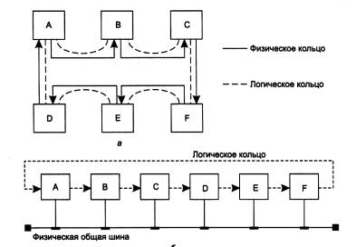 Рис. 1.15. Концентраторы различных технологий ВНИМАНИЕ Концентратор всегда изменяет физическую топологию сети, но при этом оставляет без изменения ее логическую топологию. Напомним, что под физической топологией понимается конфигурация связей, образованных отдельными частями кабеля, а под логической - конфигурация информационных потоков между компьютерами сети. Во многих случаях физическая и логическая топологии сети совпадают. Например, сеть, представленная на рис. 1.16, а, имеет физическую топологию кольцо. Компьютеры этой сети получают доступ к кабелям кольца за счет передачи друг другу специального кадра - маркера, причем этот маркер также передается последовательно от компьютера к компьютеру в том же порядке, в котором компьютеры образуют физическое кольцо, то есть компьютер А передает маркер компьютеру В, компьютер В - компьютеру С и т. д. Сеть, показанная на рис. 1.16, б, демонстрирует пример несовпадения физической и логической топологии. Физически компьютеры соединены по топологии общая шина. Доступ же к шине происходит не по алгоритму случайного доступа, применяемому в технологии Ethernet, а путем передачи маркера в кольцевом порядке: от компьютера А - компьютеру В, от компьютера В - компьютеру С и т. д. Здесь порядок передачи маркера уже не повторяет физические связи, а определяется логическим конфигурированием драйверов сетевых адаптеров. Ничто не мешает настроить сетевые адаптеры и их драйверы так, чтобы компьютеры образовали кольцо в другом порядке, например: В, А, С... При этом физическая структура сети никак не изменяется.