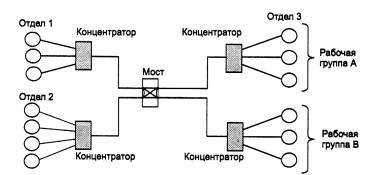 Рис. 1.17. Противоречие между логической структурой сети и структурой информационных потоков Решение проблемы состоит в отказе от идеи единой однородной разделяемой среды. Например, в рассмотренном выше примере желательно было бы сделать так, чтобы кадры, которые передают компьютеры отдела 1, выходили бы за пределы этой части сети в том и только в том случае, если эти кадры направлены какому-либо компьютеру из других отделов. С другой стороны, в сеть каждого из отделов должны попадать те и только те кадры, которые адресованы узлам этой сети. При такой организации работы сети ее производительность существенно повыситься, так как компьютеры одного отдела не будут простаивать в то время, когда обмениваются данными компьютеры других отделов. Нетрудно заметить, что в предложенном решении мы отказались от идеи общей разделяемой среды в пределах всей сети, хотя и оставили ее в пределах каждого отдела. Пропускная способность линий связи между отделами не должна совпадать с пропускной способностью среды внутри отделов. Если трафик между отделами составляет только 20 % трафика внутри отдела (как уже отмечалось, эта величина может быть другой), то и пропускная способность линий связи и коммуникационного оборудования, соединяющего отделы, может быть значительно ниже внутреннего трафика сети отдела. ВНИМАНИЕ Распространение трафика, предназначенного для компьютеров некоторого сегмента сети, только в пределах этого сегмента, называется локализацией трафика. Логическая структуризация сети - это процесс разбиения сети на сегменты с локализованным трафиком. Для логической структуризации сети используются такие коммуникационные устройства, как мосты, коммутаторы, маршрутизаторы и шлюзы. Мост (bridge) делит разделяемую среду передачи сети на части (часто называемые логическими сегментами), передавая информацию из одного сегмента в другой только в том случае, если такая передача действительно необходима, то есть если адрес компьютера назначения принадлежит другой подсети. Тем самым мост изолирует трафик одной подсети от трафика другой, повышая общую производительность передачи данных в сети. Локализация трафика не только экономит пропускную способность, но и уменьшает возможность несанкционированного доступа к данным, так как кадры не выходят за пределы своего сегмента и их сложнее перехватить злоумышленнику. На рис. 1.18 показана сеть, которая была получена из сети с центральным концентратором (см. рис. 1.17) путем его замены на мост. Сети 1-го и 2-го отделов состоят из отдельных логических сегментов, а сеть отдела 3 - из двух логических сегментов. Каждый логический сегмент построен на базе концентратора и имеет простейшую физическую структуру, образованную отрезками кабеля, связывающими компьютеры с портами концентратора.