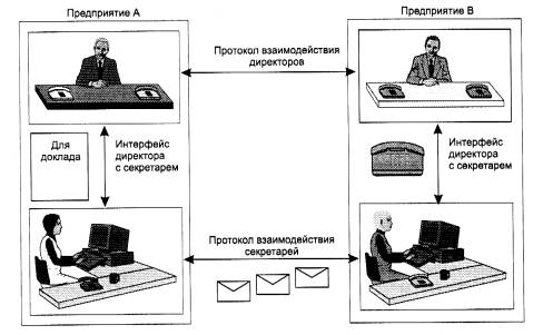 Рис. 1.23. Взаимодействие двух узлов Модули, реализующие протоколы соседних уровней и находящиеся в одном узле, также взаимодействуют друг с другом в соответствии с четко определенными правилами и с помощью стандартизованных форматов сообщений. Эти правила принято называть интерфейсом. Интерфейс определяет набор сервисов, предоставляемый данным уровнем соседнему уровню. В сущности, протокол и интерфейс выражают одно и то же понятие, но традиционно в сетях за ними закрепили разные области действия: протоколы определяют правила взаимодействия модулей одного уровня в разных узлах, а интерфейсы - модулей соседних уровней в одном узле. Средства каждого уровня должны отрабатывать, во-первых, свой собственный протокол, а во-вторых, интерфейсы с соседними уровнями. Иерархически организованный набор протоколов, достаточный для организации взаимодействия узлов в сети, называется стеком коммуникационных протоколов. Коммуникационные протоколы могут быть реализованы как программно, так и аппаратно. Протоколы нижних уровней часто реализуются комбинацией программных и аппаратных средств, а протоколы верхних уровней - как правило, чисто программными средствами. Программный модуль, реализующий некоторый протокол, часто для краткости также называют «протоколом». При этом соотношение между протоколом - формально определенной процедурой и протоколом - программным модулем, реализующим эту процедуру, аналогично соотношению между алгоритмом решения некоторой задачи и программой, решающей эту задачу. Понятно, что один и тот же алгоритм может быть запрограммирован с разной степенью эффективности. Точно так же и протокол может иметь несколько программных реализации. Именно поэтому при сравнении протоколов следует учитывать не только логику их работы, но и качество программных решений. Более того, на эффективность взаимодействия устройств в сети влияет качество всей совокупности протоколов, составляющих стек, в частности, насколько рационально распределены функции между протоколами разных уровней и насколько хорошо определены интерфейсы между ними. Протоколы реализуются не только компьютерами, но и другими сетевыми устройствами - концентраторами, мостами, коммутаторами, маршрутизаторами и т. д. Действительно, в общем случае связь компьютеров в сети осуществляется не напрямую, а через различные коммуникационные устройства. В зависимости от типа устройства в нем должны быть встроенные средства, реализующие тот или иной набор протоколов. Чтобы еще раз пояснить понятия «протокол» и «интерфейс», рассмотрим пример, не имеющий отношения к вычислительным сетям, а именно обсудим взаимодействие двух предприятий А и В; связанных между собой деловым сотрудничеством. Между предприятиями существуют многочисленные договоренности и соглашения, такие, например, как регулярные поставки продукции одного предприятия другому. В соответствии с этой договоренностью начальник отдела продаж предприятия А регулярно в начале каждого месяца посылает официальное сообщение начальнику отдела закупок предприятия В о том, сколько и какого товара может быть поставлено в этом месяце. В ответ на это сообщение начальник отдела закупок предприятия В посылает в ответ заявку установленного образца на требуемое количество продукции. Возможно, процедура 