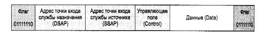 Кадр LLC обрамляется двумя однобайтовыми полями «Флаг», имеющими значение 01111110. Флаги используются на уровне MAC для определения границ кадра LLC. В соответствии с многоуровневой структурой протоколов стандартов IEEE 802, кадр LLC вкладывается в кадр уровня MAC: кадр Ethernet, Token Ring, FDDI и т. д. При этом флаги кадра LLC отбрасываются. Кадр LLC содержит поле данных и заголовок, который состоит из трех полей: