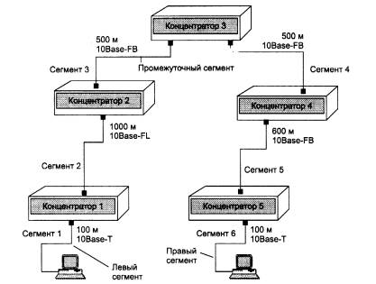 Рис. 3.13. Пример сети Ethernet, состоящей из сегментов различных физических стандартов С каждым сегментом связана постоянная задержка, названная базой, которая зависит только от типа сегмента и от положения сегмента на пути сигнала (левый, промежуточный или правый). База правого сегмента, в котором возникает коллизия, намного превышает базу левого и промежуточных сегментов. Кроме этого, с каждым сегментом связана задержка распространения сигнала вдоль кабеля сегмента, которая зависит от длины сегмента и вычисляется путем умножения времени распространения сигнала по одному метру кабеля (в битовых интервалах) на длину кабеля в метрах. Расчет заключается в вычислении задержек, вносимых каждым отрезком кабеля (приведенная в таблице задержка сигнала на 1 м кабеля умножается на длину сегмента), а затем суммировании этих задержек с базами левого, промежуточных и правого сегментов. Общее значение PDV не должно превышать 575. Так как левый и правый сегменты имеют различные величины базовой задержки, то в случае различных типов сегментов на удаленных краях сети необходимо выполнить расчеты дважды: один раз принять в качестве левого сегмента сегмент одного типа, а во второй - сегмент другого типа. Результатом можно считать максимальное значение PDV. В нашем примере крайние сегменты сети принадлежат к одному типу - стандарту 10Base-T, поэтому двойной расчет не требуется, но если бы они были сегментами разного типа, то в первом случае нужно было бы принять в качестве левого сегмент между станцией и концентратором 1, а во втором считать левым сегмент между станцией и концентратором 5. Приведенная на рисунке сеть в соответствии с правилом 4-х хабов не является корректной - в сети между узлами сегментов 1 и 6 имеется 5 хабов, хотя не все сегменты являются сегментами lOBase-FB. Кроме того, общая длина сети равна 2800 м, что нарушает правило 2500 м. Рассчитаем значение PDV для нашего примера. Левый сегмент 1/ 15,3 (база) + 100 * 0,113= 26,6. Промежуточный сегмент 2/33,5 + 1000 * 0,1 = 133,5. Промежуточный сегмент 3/ 24 + 500 * 0,1 = 74,0. Промежуточный сегмент 4/24 + 500 * 0,1 = 74,0. Промежуточный сегмент 5/ 24 + 600 * 0,1 = 84,0. Правый сегмент 6/165 + 100 * 0,113 = 176,3. Сумма всех составляющих дает значение PDV, равное 568,4. Так как значение PDV меньше максимально допустимой величины 575, то эта сеть проходит по критерию времени двойного оборота сигнала несмотря на то, что ее общая длина составляет больше 2500 м, а количество повторителей - больше 4-х. Расчет PWЧтобы признать конфигурацию сети корректной, нужно рассчитать также уменьшение межкадрового интервала повторителями, то есть величину PW. Для расчета PW также можно воспользоваться значениями максимальных величин уменьшения межкадрового интервала при прохождении повторителей различных физических сред, рекомендованными IEEE и приведенными в табл. 3.6. Таблица 3.6. Сокращение межкадрового интервала повторителями