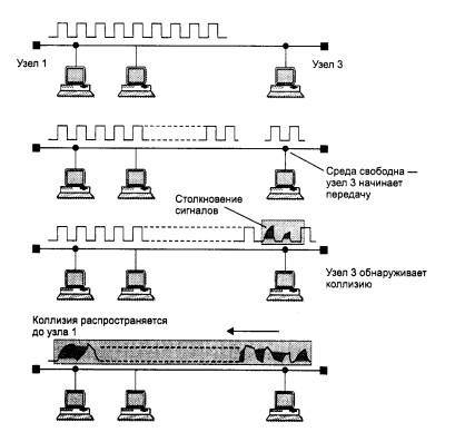 Рис. 3.3. Метод случайного доступа CSMA/CD Этапы доступа к средеВсе данные, передаваемые по сети, помещаются в кадры определенной структуры и снабжаются уникальным адресом станции назначения. Чтобы получить возможность передавать кадр, станция должна убедиться, что разделяемая среда свободна. Это достигается прослушиванием основной гармоники сигнала, которая также называется несущей частотой (carrier-sense, CS). Признаком незанятости среды является отсутствие на ней несущей частоты, которая при манчестерском способе кодирования равна 5-10 МГц, в зависимости от последовательности единиц и нулей, передаваемых в данный момент. Если среда свободна, то узел имеет право начать передачу кадра. Этот кадр изображен на рис. 3.3 первым. Узел 1 обнаружил, что среда свободна, и начал передавать свой кадр. В классической сети Ethernet на коаксиальном кабеле сигналы передатчика узла 1 распространяются в обе стороны, так что все узлы сети их получают. Кадр данных всегда сопровождается преамбулой (preamble), которая состоит из 7 байт, состоящих из значений 10101010, и 8-го байта, равного 10101011. Преамбула нужна для вхождения приемника в побитовый и побайтовый синхронизм с передатчиком. Все станции, подключенные к кабелю, могут распознать факт передачи кадра, и та станция, которая узнает собственный адрес в заголовках кадра, записывает его содержимое в свой внутренний буфер, обрабатывает полученные данные, передает их вверх по своему стеку, а затем посылает по кабелю кадр-ответ. Адрес станции источника содержится в исходном кадре, поэтому станция-получатель знает, кому нужно послать ответ. Узел 2 во время передачи кадра узлом 1 также пытался начать передачу своего кадра, однако обнаружил, что среда занята - на ней присутствует несущая частота, - поэтому узел 2 вынужден ждать, пока узел 1 не прекратит передачу кадра. После окончания передачи кадра все узлы сети обязаны выдержать технологическую паузу (Inter Packet Gap) в 9,6 мкс. Эта пауза, называемая также межкадровым интервалом, нужна для приведения сетевых адаптеров в исходное состояние, а также для предотвращения монопольного захвата среды одной станцией. После окончания технологической паузы узлы имеют право начать передачу своего кадра, так как среда свободна. Из-за задержек распространения сигнала по кабелю не все узлы строго одновременно фиксируют факт окончания передачи кадра узлом 1. В приведенном примере узел 2 дождался окончания передачи кадра узлом 1, сделал паузу в 9,6 мкс и начал передачу своего кадра. Возникновение коллизииПри описанном подходе возможна ситуация, когда две станции одновременно пытаются передать кадр данных по общей среде. Механизм прослушивания среды и пауза между кадрами не гарантируют от возникновения такой ситуации, когда две или более станции одновременно решают, что среда свободна, и начинают передавать свои кадры. Говорят, что при этом происходит коллизия (collision), так как содержимое обоих кадров сталкивается на общем кабеле и происходит искажение информации - методы кодирования, используемые в Ethernet, не позволяют выделять сигналы каждой станции из общего сигнала. ПРИМЕЧАНИЕ Заметим, что этот факт отражен в составляющей «Base(band)», присутствующей в названиях всех физических протоколов технологии Ethernet (например, 10Base-2,10Base-T и т. п.). Baseband network означает сеть с немодулированной передачей, в которой соо