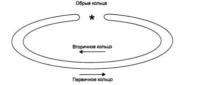 Сеть FDDI строится на основе двух оптоволоконных колец, которые образуют основной и резервный пути передачи данных между узлами сети. Наличие двух колец - это основной способ повышения отказоустойчивости в сети FDDI, и узлы, которые хотят воспользоваться этим повышенным потенциалом надежности, должны быть подключены к обоим кольцам. В нормальном режиме работы сети данные проходят через все узлы и все участки кабеля только первичного (Primary) кольца, этот режим назван режимом Thru - «сквозным» или «транзитным». Вторичное кольцо (Secondary) в этом режиме не используется. В случае какого-либо вида отказа, когда часть первичного кольца не может передавать данные (например, обрыв кабеля или отказ узла), первичное кольцо объединяется со вторичным (рис. 3.16), вновь образуя единое кольцо. Этот режим работы сети называется Wrap, то есть «свертывание» или «сворачивание» колец. Операция свертывания производится средствами концентраторов и/или сетевых адаптеров FDDI. Для упрощения этой процедуры данные по первичному кольцу всегда передаются в одном направлении (на диаграммах это направление изображается против часовой стрелки), а по вторичному - в обратном (изображается по часовой стрелке). Поэтому при образовании общего кольца из двух колец передатчики станций по-прежнему остаются подключенными к приемникам соседних станций, что позволяет правильно передавать и принимать информацию соседними станциями.