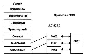 Рис. 3.16. Реконфигурация колец FDDI при отказе В стандартах FDDI много внимания отводится различным процедурам, которые позволяют определить наличие отказа в сети, а затем произвести необходимую реконфигурацию. Сеть FDDI может полностью восстанавливать свою работоспособность в случае единичных отказов ее элементов. При множественных отказах сеть распадается на несколько не связанных сетей. Технология FDDI дополняет механизмы обнаружения отказов технологии Token Ring механизмами реконфигурации пути передачи данных в сети, основанными на наличии резервных связей, обеспечиваемых вторым кольцом. Кольца в сетях FDDI рассматриваются как общая разделяемая среда передачи данных, поэтому для нее определен специальный метод доступа. Этот метод очень близок к методу доступа сетей Token Ring и также называется методом маркерного (или токенного) кольца - token ring. Отличия метода доступа заключаются в том, что время удержания маркера в сети FDDI не является постоянной величиной, как в сети Token Ring. Это время зависит от загрузки кольца - при небольшой загрузке оно увеличивается, а при больших перегрузках может уменьшаться до нуля. Эти изменения в методе доступа касаются только асинхронного трафика, который не критичен к небольшим задержкам передачи кадров. Для синхронного трафика время удержания маркера по-прежнему остается фиксированной величиной. Механизм приоритетов кадров, аналогичный принятому в технологии Token Ring, в технологии FDDI отсутствует. Разработчики технологии решили, что деление трафика на 8 уровней приоритетов избыточно и достаточно разделить трафик на два класса - асинхронный и синхронный, последний из которых обслуживается всегда, даже при перегрузках кольца. В остальном пересылка кадров между станциями кольца на уровне MAC полностью соответствует технологии Token Ring. Станции FDDI применяют алгоритм раннего освобождения маркера, как и сети Token Ring со скоростью 16 Мбит/с. Адреса уровня MAC имеют стандартный для технологий IEEE 802 формат. Формат кадра FDDI близок к формату кадра Token Ring, основные отличия заключаются в отсутствии полей приоритетов. Признаки распознавания адреса, копирования кадра и ошибки позволяют сохранить имеющиеся в сетях Token Ring процедуры обработки кадров станцией-отправителем, промежуточными станциями и станцией-получателем. На рис. 3.17 приведено соответствие структуры протоколов технологии FDDI семиуровневой модели OSI. FDDI определяет протокол физического уровня и протокол подуровня доступа к среде (MAC) канального уровня. Как и во многих других технологиях локальных сетей, в технологии FDDI используется протокол подуровня управления каналом данных LLC, определенный в стандарте IEEE 802.2. Таким образом, несмотря на то что технология FDDI была разработана и стандартизована институтом ANSI, а не комитетом IEEE, она полностью вписывается в структуру стандартов 802.