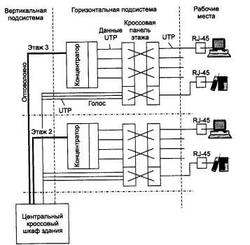 Горизонтальная подсистема соединяет кроссовый шкаф этажа с розетками пользователей. Подсистемы этого типа соответствуют этажам здания. Вертикальная подсистема соединяет кроссовые шкафы каждого этажа с центральной аппаратной здания. Следующим шагом иерархии является подсистема кампуса, которая соединяет несколько зданий с главной аппаратной всего кампуса. Эта часть кабельной системы обычно называется магистралью (backbone). Использование структурированной кабельной системы вместо хаотически проложенных кабелей дает предприятию много преимуществ.