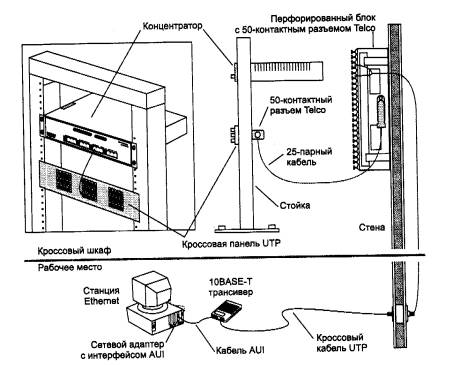В данной главе рассматриваются вопросы, связанные с реализацией рассмотренных выше протоколов физического и канального уровней в сетевом коммуникационном оборудовании. Хотя на основе оборудования только этого уровня трудно построить достаточно крупную корпоративную сеть, именно кабельные системы, сетевые адаптеры, концентраторы, мосты и коммутаторы представляют наиболее массовый тип сетевых устройств. За исключением кабельной системы, которая является протокольно независимой, устройство и функции коммуникационного оборудования остальных типов существенно зависят от того, какой конкретно протокол в них реализован. Концентратор Ethernet устроен не так, как концентратор Token Ring, а сетевой адаптер FDDI не сможет работать в сети Fast Ethernet. С другой стороны, даже в рамках одной технологии оборудование разных производителей может заметно отличаться друг от друга. В этой главе будут рассмотрены наиболее типичные варианты реализации основных и дополнительных устройств физического и канального уровней. 4.1. Структурированная кабельная системаКабельная система является фундаментом любой сети. Как при строительстве нельзя создать хороший дом на плохо построенном фундаменте, так и сеть, отлично работающая на плохой кабельной системе, - это явление из области ненаучной фантастики. Если в кабелях ежедневно происходят короткие замыкания, контакты разъемов то отходят, то снова входят в плотное соединение, добавление новой станции приводит к необходимости тестирования десятка контактов разъемов из-за того, что документация на физические соединения не ведется, то ясно, что на основе такой кабельной системы любое, самое современное и производительное оборудование будет работать из рук вон плохо. Пользователи будут недовольны большими периодами простоев и низкой производительностью сети, а обслуживающий персонал будет в постоянной «запарке», разыскивая места коротких замыканий, обрывов и плохих контактов. Причем проблем с кабельной системой становится намного больше при увеличении размеров сети. Ответом на высокие требования к качеству кабельной системы стали структурированные кабельные системы. 4.1.1. Иерархия в кабельной системеСтруктурированная кабельная система (Structured Cabling System, SCS) - это набор коммутационных элементов (кабелей, разъемов, коннекторов, кроссовых панелей и шкафов), а также методика их совместного использования, которая позволяет создавать регулярные, легко расширяемые структуры связей в вычислительных сетях. Структурированная кабельная система представляет своего рода «конструктор», с помощью которого проектировщик сети строит нужную ему конфигурацию из стандартных кабелей, соединенных стандартными разъемами и коммутируемых на стандартных кроссовых панелях. При необходимости конфигурацию связей можно легко изменить - добавить компьютер, сегмент, коммутатор, изъять ненужное оборудование, а также поменять соединения между компьютерами и концентраторами. При построении структурированной кабельной системы подразумевается, что каждое рабочее место на предприятии должно быть оснащено розетками для подключения телефона и компьютера, даже если в данный момент этого не требуется. То есть хорошая структурированная кабельная система строится избыточной, В будущем это может сэкономить средства, так как из