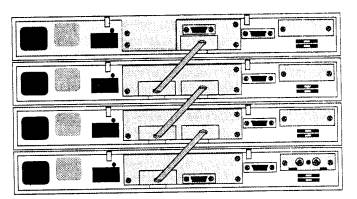 Рис. 4.13. Объединение стековых концентраторов в единое устройство с помощью специальных разъемов на задней панели Если стековые концентраторы имеют несколько внутренних шин, то при соединении в стек эти шины объединяются и становятся общими для всех устройств стека. Число объединяемых в стек корпусов может быть достаточно большим (обычно до 8, но бывает и больше). Стековые концентраторы могут поддерживать различные физические среды передачи, что делает их почти такими же гибкими, как и модульные концентраторы, но при этом стоимость этих устройств в расчете на один порт получается обычно ниже, так как сначала предприятие может купить одно устройство без избыточного шасси, а потом нарастить стек еще несколькими аналогичными устройствами. Стековые концентраторы, выпускаемые одним производителем, выполняются в едином конструктивном стандарте, что позволяет легко устанавливать их друг на друга, образуя единое настольное устройство, или помещать их в общую стойку. Экономия при организации стека происходит еще и за счет единого для всех устройств стека модуля SNMP-управления (который вставляется в один из корпусов стека как дополнительный модуль), а также общего избыточного источника питания. Модульно-стековые концентраторы представляют собой модульные концентраторы, объединенные специальными связями в стек. Как правило, корпуса таких концентраторов рассчитаны на небольшое количество модулей (1-3). Эти концентраторы сочетают достоинства концентраторов обоих типов. Выводы