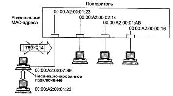 Рис. 4.7. Резервные связи между концентраторами Ethernet В некоторых моделях концентраторов разрешается использовать механизм назначения резервных портов только для оптоволоконных портов, считая, что нужно резервировать только наиболее важные связи, которые обычно выполняются на оптическом кабеле. В других же моделях резервным можно сделать любой порт. Защита от несанкционированного доступаРазделяемая среда предоставляет очень удобную возможность для несанкционированного прослушивания сети и получения доступа к передаваемым данным. Для этого достаточно подключить компьютер с программным анализатором протоколов к свободному разъему концентратора, записать на диск весь проходящий по сети трафик, а затем выделить из него нужную информацию. Разработчики концентраторов предоставляют некоторый способ защиты данных в разделяемых средах. Наиболее простой способ - назначение разрешенных МАС - адресов портам концентратора. В стандартном концентраторе Ethernet порты МАС - адресов не имеют. Защита заключается в том, что администратор вручную связывает с каждым портом концентратора некоторый МАС - адрес. Этот МАС - адрес является адресом станции, которой разрешается подключаться к данному порту. Например, на рис. 4.8 первому порту концентратора назначен МАС - адрес 123 (условная запись). Компьютер с МАС - адресом 123 нормально работает с сетью через данный порт. Если злоумышленник отсоединяет этот компьютер и присоединяет вместо него свой, концентратор заметит, что при старте нового компьютера в сеть начали поступать кадры с адресом источника 789. Так как этот адрес является недопустимым для первого порта, то эти кадры фильтруются, порт отключается, а факт нарушения прав доступа может быть зафиксирован.