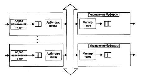 Рис. 4.33. Архитектура коммутатора с общей шиной Кадр должен передаваться по шине небольшими частями, по нескольку байт, чтобы передача кадров между несколькими портами происходила в псевдопараллельном режиме, не внося задержек в передачу кадра в целом. Размер такой ячейки данных определяется производителем коммутатора. Некоторые производители, например LANNET или Centillion, выбрали в качестве порции данных, переносимых за одну операцию по шине, ячейку АТМ с ее полем данных в 48 байт. Такой подход облегчает трансляцию протоколов локальных сетей в протокол АТМ, если коммутатор поддерживает эти технологии. Входной блок процессора помещает в ячейку, переносимую по шине, тэг, в котором указывает номер порта назначения. Каждый выходной блок процессора порта содержит фильтр тэгов, который выбирает тэги, предназначенные данному порту. Шина, так же как и коммутационная матрица, не может осуществлять промежуточную буферизацию, но так как данные кадра разбиваются на небольшие ячейки, то задержек с начальным ожиданием доступности выходного порта в такой схеме нет - здесь работает принцип коммутации пакетов, а не каналов. Коммутаторы с разделяемой памятьюТретья базовая архитектура взаимодействия портов - двухвходовая разделяемая память. Пример такой архитектуры приведен на рис. 4.34.