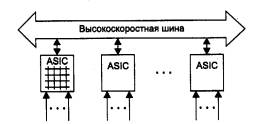 Рис. 4.30. Коммутатор на процессоре общего назначения Основным недостатком таких коммутаторов была их низкая скорость. Универсальный процессор никак не мог справиться с большим объемом специализированных операций по пересылке кадров между интерфейсными модулями. Для ускорения операций коммутации нужны были специализированные процессоры со специализированными средствами обмена данными, как в первом коммутаторе Kalpana, и они вскоре появились. Сегодня все коммутаторы используют заказные специализированные БИС - ASIC, которые оптимизированы для выполнения основных операций коммутации. Часто в одном коммутаторе используется несколько специализированных БИС, каждая из которых выполняет функционально законченную часть операций. Сравнительно низкая стоимость современных коммутаторов по сравнению с их предшественниками 3-5-летней давности объясняется массовым характером производства основных БИС, на которых каждая компания строит свои коммутаторы. Кроме процессорных микросхем для успешной неблокирующей работы коммутатору нужно также иметь быстродействующий узел для передачи кадров между процессорными микросхемами портов. В настоящее время коммутаторы используют в качестве базовой одну из трех схем, на которой строится такой узел обмена: