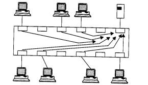 Рис. 4.43. Сеть с выделенным сервером Если коммутатор имеет все порты с одинаковой пропускной способностью, например 10 Мбит/с, в этом случае пропускная способность порта в 10 Мбит/с будет распределяться между всеми компьютерами сети. Возможности коммутатора по повышению общей пропускной способности сети оказываются для такой конфигурации невостребованными. Несмотря на микросегментацию сети, ее пропускная способность ограничивается пропускной способностью протокола одного порта, как и в случае применения концентратора с портами 10 Мбит/с. Небольшой выигрыш при использовании коммутатора будет достигаться лишь за счет уменьшения количества коллизий - вместо коллизий кадры будут просто попадать в очередь к передатчику порта коммутатора, к которому подключен сервер. Чтобы коммутатор работал в сетях с выделенным сервером более эффективно, производители коммутаторов выпускают модели с одним высокоскоростным портом на 100 Мбит/с для подключения сервера и несколькими низкоскоростными портами на 10 Мбит/с для подключения рабочих станций. В этом случае между рабочими станциями распределяется уже 100 Мбит/с, что позволяет обслуживать в неблокирующем режиме 10-30 станций в зависимости от интенсивности создаваемого ими трафика. Однако с таким коммутатором может конкурировать концентратор, поддерживающий протокол с пропускной способностью 100 Мбит/с, например Fast Ethernet. Его стоимость в пересчете за порт будет несколько ниже стоимости за порт коммутатора с одним высокоскоростным портом, а производительность сети примерно та же. Очевидно, что выбор коммуникационного устройства для сети с выделенным сервером достаточно сложен. Для принятия окончательного решения нужно принимать во внимание перспективы развития сети в отношении движения к сбалансированному трафику. Если в сети вскоре может появигься взаимодействие между рабочими станциями или же второй сервер, то выбор необходимо делать в пользу коммутатора, который сможет поддержать дополнительный трафик без ущерба по отношению к основному. В пользу коммутатора можег сыграгь и фактор расстояний - применение коммутаторов не ограничиваег максимальный диаметр сети величинами в 2500 м или 210 м, которые определяют размеры домена коллизий при использовании концентраторов Ethernet и Fast Ethernet. В целом существует тенденция постепенного вытеснения концентраторов коммутаторами, которая наблюдается примерно с 1996 года, который был назван весьма авторитетным журналом Data Communications «годом коммутаторов» в ежегодном прогнозе рынка сетевого оборудования. Стянутая в точку магистраль на коммутатореПри всем разнообразии структурных схем сетей, построенных на коммутаторах, все они используют две базовые структуры - стянутую в точку магистраль и распределенную магистраль. На основе этих базовых структур затем строятся разнообразные структуры конкретных сетей. Стянутая в точку магистраль (collapsed backbone) - это структура, при которой объединение узлов, сегментов или сетей происходит на внутренней магистрали коммутатора. Пример сети рабочей группы такой структуры приведен на рис. 4.44.