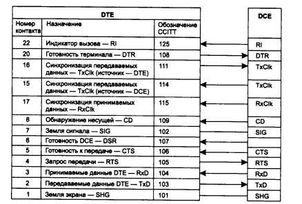 Рис. 6.3. Сигналы интерфейса RS-232C/ V.24 Для обозначения сигнальных цепей используется нумерация CCITT, которая получила название «серия 100». Существуют также двухбуквенные обозначения EIA, которые на рисунке не показаны. В интерфейсе реализован биполярный потенциальный код (+V, -V на линиях между DTE и DCE. Обычно используется довольно высокий уровень сигнала: 12 или 15 В, чтобы более надежно распознавать сигнал на фоне шума. При асинхронной передаче данных синхронизирующая информация содержится в самих кодах данных, поэтому сигналы синхронизации TxClk и RxClk отсутствуют. При синхронной передаче данных модем (DCE) передает на компьютер (DTE) сигналы синхронизации, без которых компьютер не может правильно интерпретировать потенциальный код, поступающий от модема по линии RxD. В случае когда используется код с несколькими состояниями (например, QAM), то один тактовый сигнал соответствует нескольким битам информации. Нулъ-модемный интерфейс характерен для прямой связи компьютеров на небольшом расстоянии с помощью интерфейса RS-232C/V.24. В этом случае необходимо применить специальный нуль-модемный кабель, так как каждый компьютер будет ожидать приема данных по линии RxD, что в случае применения модема будет корректно, но в случае прямого соединения компьютеров - нет. Кроме того, нуль-модемный кабель должен имитировать процесс соединения и разрыва через модемы, в котором используется несколько линий (RI, СВ и т. д.). Поэтому для нормальной работы двух непосредственно соединенных компьютеров нуль-модемный кабель должен выполнять следующие соединения: