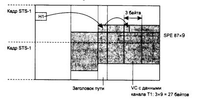 Рис. 6.8. Формат кадра STS-1 Кадр STS-1 состоит из 9 строк и 90 столбцов, то есть из 810 байт данных. Между устройствами сети кадр передается последовательно по байтам - сначала первая строка слева направо, затем вторая и т. д. Первые 3 байта каждой строки представляют собой служебные заголовки. Первые 3 строки представляют собой заголовок из 9 байт протокола уровня секции и содержат данные, необходимые для контроля и реконфигурации секции. Остальные 6 строк составляют заголовок протокола линии, который используется для реконфигурации, контроля и управления линией. Устройства сети SONET/SDH, которые работают с кадрами, имеют достаточный буфер для размещения в нем всех байт кадра, протекающих синхронно через устройство, поэтому устройство для анализа информации на некоторое время имеет полный доступ ко всем частям кадра. Таким образом, размещение служебной информации в несмежных байтах не представляет сложности для обработки кадра. Еще один столбец представляет собой заголовок протокола пути. Он используется для указания местоположения виртуальных контейнеров внутри кадра, если кадр переносит низкоскоростные данные пользовательских каналов типа Т1/Е1. Местоположение виртуальных контейнеров задается не жестко, а с помощью системы указателей (pointers). Концепция указателей является ключевой в технологии SONET/SDH. Указатель призван обеспечить синхронную передачу байт кадров с асинхронным характером вставляемых и удаляемых пользовательских данных. Указатели используются на разных уровнях. Рассмотрим, как с помощью указателя выполняется выделение поля данных кадра из синхронного потока байт. Несмотря на питание всех устройств сети SONET/SDH тактовой частотой синхронизации из одного центрального источника, синхронизация между различными сетями может незначительно нарушаться. Для компенсации этого эффекта началу поля данных кадра (называемого в стандарте SPE - Synchronous Payload Environment) разрешается смещаться относительно начала кадра произвольным образом. Реальное начало поля SPE задается указателем HI, размещенным в заголовке протокола линии. Каждый узел, поддерживающий протокол линии, обязан следить за частотой поступающих данных и компенсировать ее несовпадение с собственной частотой за счет вставки или удаления одного байта из служебного заголовка. Затем узел должен нарастить или уменьшить значения указателя первого байта поля данных СРЕ относительно начала кадра STS-1. В результате поле данных может размещаться в двух последовательных кадрах, как это показано на рис. 6.9.
