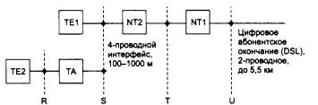 Рис. 6.17. Подключение пользовательского оборудования ISDN Устройства функциональной группы NT1 (Network Termination 1) образуют цифровое абонентское окончание (Digital Suscriber Line, DSL) на кабеле, соединяющем пользовательское оборудование с сетью ISDN. Фактически NT1 представляет собой устройство типа CSU, которое работает на физическом уровне и образует дуплексный канал с соответствующим устройством CSU, установленном на территории оператора сети ISDN. Справочная точка U соответствует точке подключения устройства NT1 к сети. Устройство NT1 может принадлежать оператору сети (хотя всегда устанавливается в помещении пользователя), а может принадлежать и пользователю. В Европе принято считать устройство NT1 частью оборудования сети, поэтому пользовательское оборудование (например, маршрутизатор с интерфейсом ISDN) выпускается без встроенного устройства NT1. В Северной Америке принято считать устройство NT1 принадлежностью пользовательского оборудования, поэтому для этого применения оборудование часто выпускается со встроенным устройством NT1. Если пользователь подключен через интерфейс BRI, то цифровое абонентское окончание выполнено по 2-проводной схеме (как и обычное окончание аналоговой телефонной сети). Для организации дуплексного режима используется технология одновременной выдачи передатчиками потенциального кода 2B1Q с эхо - подавлением и вычитанием своего сигнала из суммарного. Максимальная длина абонентского окончания в этом случае составляет 5,5 км. При использовании интерфейса PRI цифровое абонентское окончание выполняется по схеме канала Т1 или Е1, то есть является 4-проводным с максимальной длиной около 1800 м. Устройства функциональной группы NT2 (Network Termination 2) представляют собой устройства канального или сетевого уровня, которые выполняют функции концентрации пользовательских интерфейсов и их мультиплексирование. Например, к этому типу оборудования относятся: офисная АТС (РВХ), коммутирующая несколько интерфейсов BRI, маршрутизатор, работающий в режиме коммутации пакетов (например, по каналу D), простой мультиплексор TDM, который мультиплексирует несколько низкоскоростных каналов в один канал типа В. Точка подключения оборудования типа NT2 к устройству NT1 называется справочной точкой типа Т. Наличие этого типа оборудования не является обязательным в отличие от NT1. Устройства функциональной группы ТЕ1 (Terminal Equipment 1) относятся к устройствам, которые поддерживают интерфейс пользователя BRI или PRI. Справочная точка S соответствует точке подключения отдельного терминального оборудования, поддерживающего один из интерфейсов пользователя ISDN. Таким оборудованием может быть цифровой телефон или факс-аппарат. Так как оборудование типа NT2 может отсутствовать, то справочные точки S и Т объединяются и обозначаются как S/T. Устройства функциональной группы ТЕ2 (Terminal Equipment 2) представляют собой устройства, которые не поддерживают интерфейс BRI или PRI. Таким устройством может быть компьютер, маршрутизатор с последовательными интерфейсами, не относящимися к ISDN, например RS-232C, Х.21 или V.35. Для подключения такого устройства к сети ISDN необходимо использовать терминальный адаптер (Terminal Adaptor, ТА). Для компьютеров терминальные адаптеры выпускаются в формате сетевых адаптеров - как встраиваемая карта. Физически интерфейс в точке S/T представляет собой 4-проводную линию. Так 