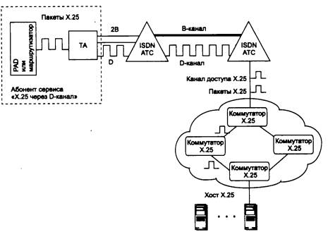 Рис. 6.20. Доступ к сети Х.25 через канал типа D сети ISDN Сети ISDN не рассматриваются разработчиками корпоративных сетей как хорошее средство для создания магистрали сети. Основная причина - отсутствие скоростной службы коммутации пакетов и невысокие скорости каналов, предоставляемых конечным пользователям. Для целей же подключения мобильных и домашних пользователей, небольших филиалов и образования резервных каналов связи сети ISDN сейчас используются очень широко, естественно там, где они существуют. Производители коммуникационного оборудования выпускают широкий спектр продуктов для подключения локальных сетей к ISDN - терминальных адаптеров, удаленных мостов и офисных маршрутизаторов невысокой стоимости. Выводы
