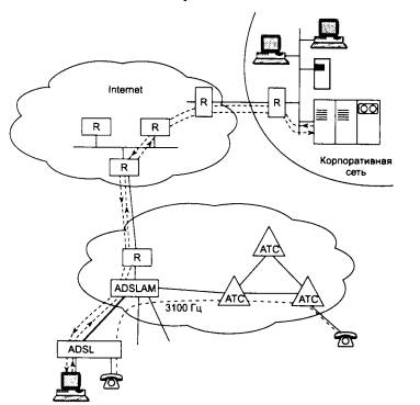 Рис. 6.38. Отличия условий роботы ADSL-модемов от обычных модемов ADSL-модемы, подключаемые к обоим концам короткой линии между абонентом и АТС, образуют три канала: быстрый канал передачи данных из сети в компьютер, менее быстрый дуплексный канал передачи данных из компьютера в сеть и простой канал телефонной связи, по которому передаются обычные телефонные разговоры. Передача данных в канале «сеть-абонент» происходит со скоростью от 1,5 до 6 Мбит/с, в канале «абонент-сеть» - со скоростью от 16 Кбит/с до 1 Мбит/с. В обоих случаях конкретная величина скорости передачи зависит от длины и качества линии. Асимметричный характер скорости передачи данных вводится специально, так как удаленный пользователь Internet или корпоративной сети обычно загружает данные из сети в свой компьютер, а в обратном направлении идут либо квитанции, либо поток данных существенно меньшей скорости. Для получения асимметрии скорости полоса пропускания абонентского окончания делится между каналами также асимметрично. На дальнем конце абонентского окончания должен располагаться так называемый мультиплексор доступа ADSL - ADSLAM. Этот мультиплексор выделяет подканалы из общего канала и отправляет голосовой подканал в 3100 Гц на АТС, а высокоскоростные каналы данных направляет на маршрутизатор, который должен находиться рядом с ADSLAM. Одно из главных преимуществ технологии ADSL по сравнению с аналоговыми модемами и протоколами ISDN и HDSL - то, что поддержка голоса никак не отражается на параллельной передаче данных по двум быстрым каналам. Причина подобного эффекта состоит в том, что ADSL основана на принципах разделения частот, благодаря чему голосовой канал надежно отделяется от двух других каналов передачи данных. Такой метод передачи гарантирует надежную работу канала POTS даже при нарушении питания ADSL-модема. Никакие конкурирующие системы передачи данных не обеспечивают работу обычного телефонного канала столь же надежно. Хотя технологии ISDN и HDSL поддерживают режим обычной телефонной связи, для ее установления они требуют организации специального канала с пропускной способностью 64 Кбит/с. Маршрутизатор, расположенный в здании АТС, должен соединяться выделенным высокоскоростным каналом с другим маршрутизатором Internet (или другой сети с коммутацией пакетов). Если центральная сеть предприятия подключена к Internet через выделенный высокоскоростной канал, то все удаленные пользователи, у которых установлены модемы ADSL, получают высокоскоростной доступ к сети своего предприятия на тех же телефонных каналах, которые всегда соединяли их с городской АТС. Широкое распространение технологий *DSL должно сопровождаться некоторой перестройкой работы поставщиков услуг Internet и поставщиков услуг телефонных сетей, так как их оборудование должно теперь работать совместно. Стандарт на ADSL-модемы уже принят. Правда, он узаконил только один из реализованных в этой технологии видов кодирования - DMT, в то время как более дешевое САР - кодирование, используемое некоторыми разработчиками этой технологии, пока не является стандартным. Модемы *DSL являются частным случаем модемов, работающих на коротких ненагруженных линиях. Еще до появления технологий ADSL и ей подобных, модемы short range или short haul применялись для связи не очень удаленных между собой сетей и компьютеров. Этот класс модемов включал ка