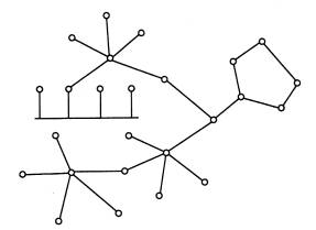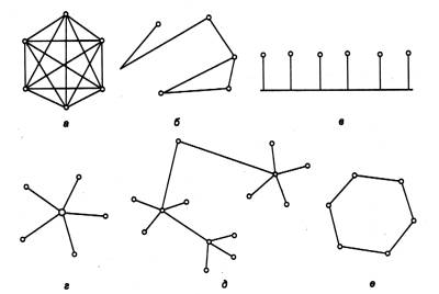 Рис. 1.10. Типовые топологии сетей В то время как небольшие сети, как правило, имеют типовую топологию - звезда, кольцо или общая шина, для крупных сетей характерно наличие произвольных связей между компьютерами. В таких сетях можно выделить отдельные произвольно связанные фрагменты (подсети), имеющие типовую топологию, поэтому их называют сетями со смешанной топологией (рис. 1.11).