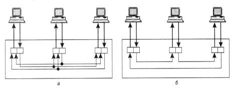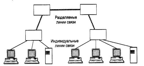 Рис. 1.11. Смешанная топология Организация совместного использования линий связиТолько в сети с полносвязной топологией для соединения каждой пары компьютеров имеется отдельная линия связи. Во всех остальных случаях неизбежно возникает вопрос о том, как организовать совместное использование линий связи несколькими компьютерами сети. Как и всегда при разделении ресурсов, главной целью здесь является удешевление сети. В вычислительных сетях используют как индивидуальные линии связи между компьютерами, так и разделяемые (shared), когда одна линия связи попеременно используется несколькими компьютерами. В случае применения разделяемых линий связи (часто используется также термин разделяемая среда передачи данных - shared media) возникает комплекс проблем, связанных с их совместным использованием, который включает как чисто электрические проблемы обеспечения нужного качества сигналов при подключении к одному и тому же проводу нескольких приемников и передатчиков, так и логические проблемы разделения во времени доступа к этим линиям. Классическим примером сети с разделяемыми линиями связи являются сети с топологией «общая шина», в которых один кабель совместно используется всеми компьютерами сети. Ни один из компьютеров сети в принципе не может индивидуально, независимо от всех других компьютеров сети, использовать кабель, так как при одновременной передаче данных сразу несколькими узлами сигналы смешиваются и искажаются. В топологиях «кольцо» или «звезда» индивидуальное использование линий связи, соединяющих компьютеры, принципиально возможно, но эти кабели часто также рассматривают как разделяемые для всех компьютеров сети, так что, например, только один компьютер кольца имеет право в данный момент времени отправлять по кольцу пакеты другим компьютерам. Существуют различные способы решения задачи организации совместного доступа к разделяемым линиям связи. Внутри компьютера проблемы разделения линий связи между различными модулями также существуют - примером является доступ к системной шине, которым управляет либо процессор, либо специальный арбитр шины. В сетях организация совместного доступа к линиям связи имеет свою специфику из-за существенно большего времени распространения сигналов по длинным проводам, к тому же это время для различных пар компьютеров может быть различным. Из-за этого процедуры согласования доступа к линии связи могут занимать слишком большой промежуток времени и приводить к значительным потерям производительности сети. Несмотря на все эти сложности, в локальных сетях разделяемые линии связи используются очень часто. Этот подход, в частности, реализован в широко распространенных классических технологиях Ethernet и Token Ring. Однако в последние годы наметилась тенденция отказа от разделяемых сред передачи данных и в локальных сетях. Это связано с тем, что за достигаемое таким образом удешевление сети приходится расплачиваться производительностью. Сеть с разделяемой средой при большом количестве узлов будет работать всегда медленнее, чем аналогичная сеть с индивидуальными линиями связи, так как пропускная способность индивидуальной линии связи достается одному компьютеру, а при ее совместном использовании - делится на все компьютеры сети. Часто с такой потерей производительности мир