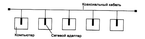 Рис. 1.13. Сеть Ethernet Суть случайного метода доступа состоит в следующем. Компьютер в сети Ethernet может передавать данные по сети, только если сеть свободна, то есть если никакой другой компьютер в данный момент не занимается обменом. Поэтому важной частью технологии Ethernet является процедура определения доступности среды. После того как компьютер убедился, что сеть свободна, он начинает передачу, при этом «захватывает» среду. Время монопольного использования разделяемой среды одним узлом ограничивается временем передачи одного кадра. Кадр - это единица данных, которыми обмениваются компьютеры в сети Ethernet. Кадр имеет фиксированный формат и наряду с полем данных содержит различную служебную информацию, например адрес получателя и адрес отправителя. Сеть Ethernet устроена так, что при попадании кадра в разделяемую среду передачи данных все сетевые адаптеры одновременно начинают принимать этот кадр. Все они анализируют адрес назначения, располагающийся в одном из начальных полей кадра, и, если этот адрес совпадает с их собственным адресом, кадр помещается во внутренний буфер сетевого адаптера. Таким образом компьютер-адресат получает предназначенные ему данные. Иногда может возникать ситуация, когда одновременно два или более компьютера решают, что сеть свободна, и начинают передавать информацию. Такая ситуация, называемая коллизией, препятствует правильной передаче данных по сети. В стандарте Ethernet предусмотрен алгоритм обнаружения и корректной обработки коллизий. Вероятность возникновения коллизии зависит от интенсивности сетевого трафика. После обнаружения коллизии сетевые адаптеры, которые пытались передать свои кадры, прекращают передачу и после паузы случайной длительности пытаются снова получить доступ к среде и передать тот кадр, который вызвал коллизию. Главным достоинством сетей Ethernet, благодаря которому они стали такими популярными, является их экономичность. Для построения сети достаточно иметь по одному сетевому адаптеру для каждого компьютера плюс один физический сегмент коаксиального кабеля нужной длины. Другие базовые технологии, например Token Ring, для создания даже небольшой сети требуют наличия дополнительного устройства - концентратора. Кроме того, в сетях Ethernet реализованы достаточно простые алгоритмы доступа к среде, адресации и передачи данных. Простота логики работы сети ведет к упрощению и, соответственно, удешевлению сетевых адаптеров и их драйверов. По той же причине адаптеры сети Ethernet обладают высокой надежностью. И наконец, еще одним замечательным свойством сетей Ethernet является их хорошая расширяемость, то есть легкость подключения новых узлов. Другие базовые сетевые технологии - Token Ring, FDDI, l00VGAny-LAN, хотя и обладают многими индивидуальными чертами, в то же время имеют много общих свойств с Ethernet. В первую очередь - это применение регулярных фиксированных топологий (иерархическая звезда и кольцо), а также разделяемых сред передачи данных. Существенные отличия одной технологии от другой связаны с особенностями используемого метода доступа к разделяемой среде. Так, отличия технологии Ethernet от технологии Token Ring во многом определяются спецификой заложенных в них методов разделения среды - случайного алгоритма доступа в Ethernet и метода доступа путем передачи маркера в Token Ring. 1.2.6. Структуризация как ср