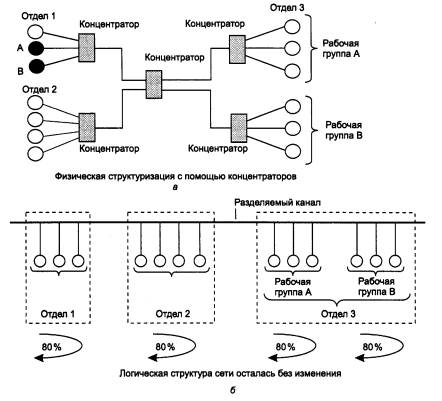 Рис. 1.16. Логическая и физическая топологии сети Другим примером несовпадения физической и логической топологий сети является уже рассмотренная сеть на рис. 1.15, а. Концентратор Ethernet поддерживает в сети физическую топологию звезда. Однако логическая топология сети осталась без изменений - это общая шина. Так как концентратор повторяет данные, пришедшие с любого порта, на всех остальных портах, то они появляются одновременно на всех физических сегментах сети, как и в сети с физической общей шиной. Логика доступа к сети совершенно не меняется: все компоненты алгоритма случайного доступа - определение незанятости среды, захват среды, распознавание и отработка коллизий - остаются в силе. Физическая структуризация сети с помощью концентраторов полезна не только для увеличения расстояния между узлами сети, но и для повышения ее надежности. Например, если какой-либо компьютер сети Ethernet с физической общей шиной из-за сбоя начинает непрерывно передавать данные по общему кабелю, то вся сеть выходит из строя, и для решения этой проблемы остается только один выход - вручную отсоединить сетевой адаптер этого компьютера от кабеля. В сети Ethernet, построенной с использованием концентратора, эта проблема может быть решена автоматически - концентратор отключает свой порт, если обнаруживает, что присоединенный к нему узел слишком долго монопольно занимает сеть. Концентратор может блокировать некорректно работающий узел и в других случаях, выполняя роль некоторого управляющего узла. Логическая структуризация сетиФизическая структуризация сети полезна во многих отношениях, однако в ряде случаев, обычно относящихся к сетям большого и среднего размера, невозможно обойтись без логической структуризации сети. Наиболее важной проблемой, не решаемой путем физической структуризации, остается проблема перераспределения передаваемого трафика между различными физическими сегментами сети. В большой сети естественным образом возникает неоднородность информационных потоков: сеть состоит из множества подсетей рабочих групп, отделов, филиалов предприятия и других административных образований. Очень часто наиболее интенсивный обмен данными наблюдается между компьютерами, принадлежащими к одной подсети, и только небольшая часть обращений происходит к ресурсам компьютеров, находящихся вне локальных рабочих групп. (До недавнего времени такое соотношение трафиков не подвергалось сомнению, и был даже сформулирован эмпирический закон «80/20», в соответствии с которым в каждой подсети 80 % трафика является внутренним и только 20 % - внешним.) Сейчас характер нагрузки сетей во многом изменился, широко внедряется технология intranet, на многих предприятиях имеются централизованные хранилища корпоративных данных, активно используемые всеми сотрудниками предприятия. Все это не могло не повлиять на распределение информационных потоков. И теперь не редки ситуации, когда интенсивность внешних обращений выше интенсивности обмена между «соседними» машинами. Но независимо от того, в какой пропорции распределяются внешний и внутренний трафик, для повышения эффективности работы сети неоднородность информационных потоков необходимо учитывать. Сеть с типовой топологией (шина, кольцо, звезда), в которой все физические сегменты рассматриваются в качестве одной 