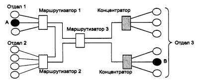 Рис. 1.17. Противоречие между логической структурой сети и структурой информационных потоков Решение проблемы состоит в отказе от идеи единой однородной разделяемой среды. Например, в рассмотренном выше примере желательно было бы сделать так, чтобы кадры, которые передают компьютеры отдела 1, выходили бы за пределы этой части сети в том и только в том случае, если эти кадры направлены какому-либо компьютеру из других отделов. С другой стороны, в сеть каждого из отделов должны попадать те и только те кадры, которые адресованы узлам этой сети. При такой организации работы сети ее производительность существенно повыситься, так как компьютеры одного отдела не будут простаивать в то время, когда обмениваются данными компьютеры других отделов. Нетрудно заметить, что в предложенном решении мы отказались от идеи общей разделяемой среды в пределах всей сети, хотя и оставили ее в пределах каждого отдела. Пропускная способность линий связи между отделами не должна совпадать с пропускной способностью среды внутри отделов. Если трафик между отделами составляет только 20 % трафика внутри отдела (как уже отмечалось, эта величина может быть другой), то и пропускная способность линий связи и коммуникационного оборудования, соединяющего отделы, может быть значительно ниже внутреннего трафика сети отдела. ВНИМАНИЕ Распространение трафика, предназначенного для компьютеров некоторого сегмента сети, только в пределах этого сегмента, называется локализацией трафика. Логическая структуризация сети - это процесс разбиения сети на сегменты с локализованным трафиком. Для логической структуризации сети используются такие коммуникационные устройства, как мосты, коммутаторы, маршрутизаторы и шлюзы. Мост (bridge) делит разделяемую среду передачи сети на части (часто называемые логическими сегментами), передавая информацию из одного сегмента в другой только в том случае, если такая передача действительно необходима, то есть если адрес компьютера назначения принадлежит другой подсети. Тем самым мост изолирует трафик одной подсети от трафика другой, повышая общую производительность передачи данных в сети. Локализация трафика не только экономит пропускную способность, но и уменьшает возможность несанкционированного доступа к данным, так как кадры не выходят за пределы своего сегмента и их сложнее перехватить злоумышленнику. На рис. 1.18 показана сеть, которая была получена из сети с центральным концентратором (см. рис. 1.17) путем его замены на мост. Сети 1-го и 2-го отделов состоят из отдельных логических сегментов, а сеть отдела 3 - из двух логических сегментов. Каждый логический сегмент построен на базе концентратора и имеет простейшую физическую структуру, образованную отрезками кабеля, связывающими компьютеры с портами концентратора.