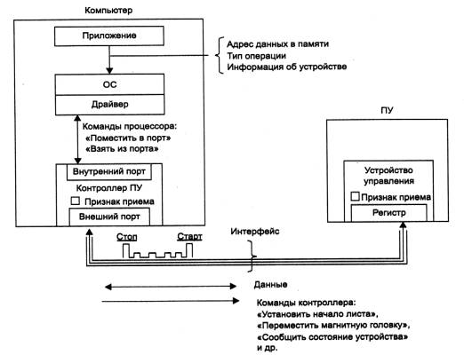 1.2. Основные проблемы построения сетейПри создании вычислительных сетей их разработчикам пришлось решить много проблем. В этом разделе мы рассмотрим только наиболее важные из них, причем в той последовательности, в которой они естественно возникали в процессе развития и совершенствования сетевых технологий. Механизмы взаимодействия компьютеров в сети многое позаимствовали у схемы взаимодействия компьютера с периферийными устройствами, поэтому начнем рассмотрение принципов работы сети с этого «досетевого» случая. 1.2.1. Связь компьютера с периферийными устройствамиДля обмена данными между компьютером и периферийным устройством (ПУ) в компьютере предусмотрен внешний интерфейс (рис. 1.6), то есть набор проводов, соединяющих компьютер и периферийное устройство, а также набор правил обмена информацией по этим проводам (иногда вместо термина интерфейс употребляется термин протокол - подробней об этих важных терминах мы еще поговорим). Примерами интерфейсов, используемых в компьютерах, являются параллельный интерфейс Centronics, предназначенный, как правило, для подключения принтеров, и последовательный интерфейс RS-232C, через который подключаются мышь, модем и много других устройств. Интерфейс реализуется со стороны компьютера совокупностью аппаратных и программных средств: контроллером ПУ и специальной программой, управляющей этим контроллером, которую часто называют драйвером соответствующего периферийного устройства. Со стороны ПУ интерфейс чаще всего реализуется аппаратным устройством управления, хотя встречаются и программно-управляемые периферийные устройства. Программа, выполняемая процессором, может обмениваться данными с помощью команд ввода/вывода с любыми модулями, подключенными к внутренней шине компьютера, в том числе и с контроллерами ПУ. Периферийные устройства могут принимать от компьютера как данные, например байты информации, которую нужно распечатать на бумаге, так и команды управления, в ответ на которые ПУ может выполнить специальные действия, например перевести головку диска на требуемую дорожку или же вытолкнуть лист бумаги из принтера. Периферийное устройство использует внешний интерфейс компьютера не только для приема информации, но и для передачи информации в компьютер, то есть обмен данными по внешнему интерфейсу, как правило, является двунаправленным. Так, например, даже принтер, который по своей природе является устройством вывода информации, возвращает в компьютер данные о своем состоянии. Контроллеры ПУ принимают команды и данные от процессора в свой внутренний буфер, который часто называется регистром или портом, затем выполняют необходимые преобразования этих данных и команд в соответствии с форматами, понятными ПУ, и выдают их на внешний интерфейс. Распределение обязанностей между контроллером и драйвером ПУ может быть разным, но обычно контроллер выполняет набор простых команд по управлению ПУ, а драйвер использует эти команды, чтобы заставить устройство совершать более сложные действия по некоторому алгоритму. Например, контроллер принтера может поддерживать такие элементарные команды, как «Печать символа», «Перевод строки», «Возврат каретки» и т. п. Драйвер же принтера с помощью этих команд организует печать строк символов, разделение документа на страницы и другие 