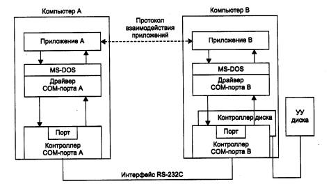 Рис. 1.6. Связь компьютера с периферийным устройством Рассмотрим схему передачи одного байта информации от прикладной программы на периферийное устройство. Программа, которой потребовалось выполнить обмен данными с ПУ, обращается к драйверу этого устройства, сообщая ему в качестве параметра адрес байта памяти, который нужно передать. Драйвер загружает значение этого байта в буфер контроллера ПУ, который начинает последовательно передавать биты в линию связи, представляя каждый бит соответствующим электрическим сигналом. Чтобы устройству управления ПУ стало понятно, что начинается передача байта, перед передачей первого бита информации контроллер ПУ формирует стартовый сигнал специфической формы, а после передачи последнего информационного бита - столовый сигнал. Эти сигналы синхронизируют передачу байта. Кроме информационных бит, контроллер может передавать бит контроля четности для повышения достоверности обмена. Устройство управления, обнаружив на соответствующей линии стартовый бит, выполняет подготовительные действия и начинает принимать информационные биты, формируя из них байт в своем приемном буфере. Если передача сопровождается битом четности, то выполняется проверка правильности передачи: при правильно выполненной передаче в соответствующем регистре устройства управления устанавливается признак завершения приема информации. Обычно на драйвер возлагаются наиболее сложные функции протокола (например, подсчет контрольной суммы последовательности передаваемых байтов, анализ состояния периферийного устройства, проверка правильности выполнения команды). Но даже самый примитивный драйвер контроллера должен поддерживать как минимум две операции: «Взять данные из контроллера в оперативную память» и «Передать данные из оперативной памяти в контроллер». Существуют как весьма специализированные интерфейсы, пригодные для подключения узкого класса устройств (например, графических мониторов высокого разрешения фирмы Vista), так и интерфейсы общего назначения, являющиеся стандартными и позволяющие подключать различные периферийные устройства. Примером такого интерфейса является интерфейс RS-232C, который поддерживается многими терминалами, принтерами, графопостроителями, манипуляторами типа «мышь» и многими другими устройствами. 1.2.2. Простейший случай взаимодействия двух компьютеровВ самом простом случае взаимодействие компьютеров может быть реализовано с помощью тех же самых средств, которые используются для взаимодействия компьютера с периферией, например, через последовательный интерфейс RS-232C. В отличие от взаимодействия компьютера с периферийным устройством, когда программа работает, как правило, только с одной стороны - со стороны компьютера, в этом случае происходит взаимодействие двух программ, работающих на каждом из компьютеров. Программа, работающая на одном компьютере, не может получить непосредственный доступ к ресурсам другого компьютера - его дискам, файлам, принтеру. Она может только «попросить» об этом программу, работающую на том компьютере, которому принадлежат эти ресурсы. Эти «просьбы» выражаются в виде сообщений, передаваемых по каналам связи между компьютерами. Сообщения могут содержать не только команды на выполнение некоторых действий, но и собственно информацио