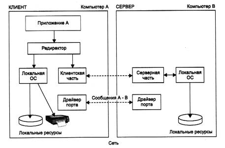 Рис. 1.7. Взаимодействие двух компьютеров Драйвер СОМ-порта вместе с контроллером СОМ-порта работают примерно так же, как и в описанном выше случае взаимодействия ПУ с компьютером. Однако при этом роль устройства управления ПУ выполняет контроллер и драйвер СОМ-порта другого компьютера. Вместе они обеспечивают передачу по кабелю между компьютерами одного байта информации. (В «настоящих» локальных сетях подобные функции передачи данных в линию связи выполняются сетевыми адаптерами и их драйверами.) Драйвер компьютера В периодически опрашивает признак завершения приема, устанавливаемый контроллером при правильно выполненной передаче данных, и при его появлении считывает принятый байт из буфера контроллера в оперативную память, делая его тем самым доступным для программ компьютера В. В некоторых случаях драйвер вызывается асинхронно, по прерываниям от контроллера. Таким образом, в распоряжении программ компьютеров А и В имеется средство для передачи одного байта информации. Но рассматриваемая в нашем примере задача значительно сложнее, так как нужно передать не один байт, а определенную часть заданного файла. Все связанные с этим дополнительные проблемы должны решить программы более высокого уровня, чем драйверы СОМ-портов. Для определенности назовем такие программы компьютеров А и В приложением А и приложением В соответственно. Итак, приложение А должно сформировать сообщение-запрос для приложения В. В запросе необходимо указать имя файла, тип операции (в данном случае - чтение), смещение и размер области файла, содержащей нужные данные. Чтобы передать это сообщение компьютеру В, приложение А обращается к драйверу СОМ-порта, сообщая ему адрес в оперативной памяти, по которому драйвер находит сообщение и затем передает его байт за байтом приложению В. Приложение В, приняв запрос, выполняет его, то есть считывает требуемую область файла с диска с помощью средств локальной ОС в буферную область своей оперативной памяти, а далее с помощью драйвера СОМ-порта передает считанные данные по каналу связи в компьютер А, где они и попадают к приложению А. Описанные функции приложения А могла бы выполнить сама программа текстового редактора, но включать эти функции в состав каждого приложения - текстовых редакторов, графических редакторов, систем управления базами данных и других приложений, которым нужен доступ к файлам, - не очень рационально (хотя существует большое количество программ, которые действительно самостоятельно решают все задачи по межмашинному обмену данными, например Kermit - программа обмена файлами через СОМ-порты, реализованная для различных ОС, Norton Commander 3.0 с его функцией Link). Гораздо выгоднее создать специальный программный модуль, который будет выполнять функции формирования сообщений-запросов и приема результатов для всех приложений компьютера. Как уже было ранее сказано, такой служебный модуль называется клиентом. На стороне же компьютера В должен работать другой модуль - сервер, постоянно ожидающий прихода запросов на удаленный доступ к файлам, расположенным на диске этого компьютера. Сервер, приняв запрос из сети, обращается к локальному файлу и выполняет с ним заданные действия, возможно, с участием локальной ОС. Программные клиент и сервер выполняют системные функции по обслуживанию запросов при