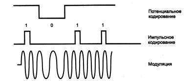 Рис. 1.8. Взаимодействие программных компонентов при связи двух компьютеров Очень удобной и полезной функцией клиентской программы является способность отличить запрос к удаленному файлу от запроса к локальному файлу. Если клиентская программа умеет это делать, то приложения не должны заботиться о том, с каким файлом они работают (локальным или удаленным), клиентская программа сама распознает и перенаправляет (redirect) запрос к удаленной машине. Отсюда и название, часто используемое для клиентской части сетевой ОС, - редиректор. Иногда функции распознавания выделяются в отдельный программный модуль, в этом случае редиректором называют не всю клиентскую часть, а только этот модуль. 1.2.3. Проблемы физической передачи данных по линиям связиДаже при рассмотрении простейшей сети, состоящей всего из двух машин, можно увидеть многие проблемы, присущие любой вычислительной сети, в том числе проблемы, связанные с физической передачей сигналов по линиям связи, без решения которой невозможен любой вид связи. В вычислительной технике для представления данных используется двоичный код. Внутри компьютера единицам и нулям данных соответствуют дискретные электрические сигналы. Представление данных в виде электрических или оптических сигналов называется кодированием. Существуют различные способы кодирования двоичных цифр 1 и 0, например, потенциальный способ, при котором единице соответствует один уровень напряжения, а нулю - другой, или импульсный способ, когда для представления цифр используются импульсы различной или одной полярности. Аналогичные подходы могут быть использованы для кодирования данных и при передаче их между двумя компьютерами по линиям связи. Однако эти линии связи отличаются по своим электрическим характеристикам от тех, которые существуют внутри компьютера. Главное отличие внешних линий связи от внутренних состоит в их гораздо большей протяженности, а также в том, что они проходят вне экранированного корпуса по пространствам, зачастую подверженным воздействию сильных электромагнитных помех. Все это приводит к значительно большим искажениям прямоугольных импульсов (например, «заваливанию» фронтов), чем внутри компьютера. Поэтому для надежного распознавания импульсов на приемном конце линии связи при передаче данных внутри и вне компьютера не всегда можно использовать одни и те же скорости и способы кодирования. Например, медленное нарастание фронта импульса из-за высокой емкостной нагрузки линии требует передачи импульсов с меньшей скоростью (чтобы передний и задний фронты соседних импульсов не перекрывались и импульс успел дорасти до требуемого уровня). В вычислительных сетях применяют как потенциальное, так и импульсное кодирование дискретных данных, а также специфический способ представления данных, который никогда не используется внутри компьютера, - модуляцию (рис. 1.9). При модуляции дискретная информация представляется синусоидальным сигналом той частоты, которую хорошо передает имеющаяся линия связи.