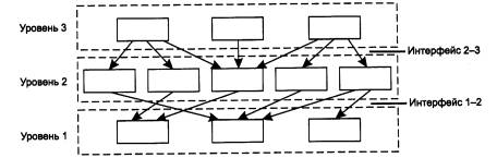 Рис. 1.20. Пример декомпозиции задачи При декомпозиции часто используют многоуровневый подход. Он заключается в следующем. Все множество модулей разбивают на уровни. Уровни образуют иерархию, то есть имеются вышележащие и нижележащие уровни (рис. 1.21). Множество модулей, составляющих каждый уровень, сформировано таким образом, что для выполнения своих задач они обращаются с запросами только к модулям непосредственно примыкающего нижележащего уровня. С другой стороны, результаты работы всех модулей, принадлежащих некоторому уровню, могут быть переданы только модулям соседнего вышележащего уровня. Такая иерархическая декомпозиция задачи предполагает четкое определение функции каждого уровня и интерфейсов между уровнями. Интерфейс определяет набор функций, которые нижележащий уровень предоставляет вышележащему. В результате иерархической декомпозиции достигается относительная независимость уровней, а значит, и возможность их легкой замены.