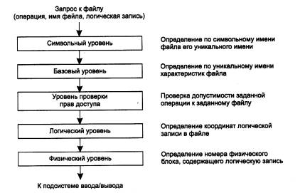 Рис. 1.21. Многоуровневый подход - создание иерархии задач Средства сетевого взаимодействия, конечно, тоже могут быть представлены в виде иерархически организованного множества модулей. При этом модули нижнего уровня могут, например, решать все вопросы, связанные с надежной передачей электрических сигналов между двумя соседними узлами. Модули более высокого уровня организуют транспортировку сообщений в пределах всей сети, пользуясь для этого средствами упомянутого нижележащего уровня. А на верхнем уровне работают модули, предоставляющие пользователям доступ к различным службам - файловой, печати и т. п. Конечно, это только один из множества возможных вариантов деления общей задачи организации сетевого взаимодействия на частные подзадачи. Многоуровневый подход к описанию и реализации функций системы применяется не только в отношении сетевых средств. Такая модель функционирования используется, например, в локальных файловых системах, когда поступивший запрос на доступ к файлу последовательно обрабатывается несколькими программными уровнями (рис. 1.22). Запрос вначале анализируется верхним уровнем, на котором осуществляется последовательный разбор составного символьного имени файла и определение уникального идентификатора файла. Следующий уровень находит по уникальному имени все основные характеристики файла: адрес, атрибуты доступа и т. п. Затем на более низком уровне осуществляется проверка прав доступа к этому файлу, а далее, после расчета координат области файла, содержащей требуемые данные, выполняется физический обмен с внешним устройством с помощью драйвера диска.
