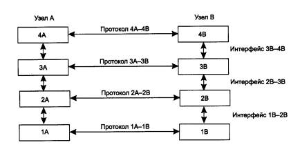 Рис. 1.23. Взаимодействие двух узлов Модули, реализующие протоколы соседних уровней и находящиеся в одном узле, также взаимодействуют друг с другом в соответствии с четко определенными правилами и с помощью стандартизованных форматов сообщений. Эти правила принято называть интерфейсом. Интерфейс определяет набор сервисов, предоставляемый данным уровнем соседнему уровню. В сущности, протокол и интерфейс выражают одно и то же понятие, но традиционно в сетях за ними закрепили разные области действия: протоколы определяют правила взаимодействия модулей одного уровня в разных узлах, а интерфейсы - модулей соседних уровней в одном узле. Средства каждого уровня должны отрабатывать, во-первых, свой собственный протокол, а во-вторых, интерфейсы с соседними уровнями. Иерархически организованный набор протоколов, достаточный для организации взаимодействия узлов в сети, называется стеком коммуникационных протоколов. Коммуникационные протоколы могут быть реализованы как программно, так и аппаратно. Протоколы нижних уровней часто реализуются комбинацией программных и аппаратных средств, а протоколы верхних уровней - как правило, чисто программными средствами. Программный модуль, реализующий некоторый протокол, часто для краткости также называют «протоколом». При этом соотношение между протоколом - формально определенной процедурой и протоколом - программным модулем, реализующим эту процедуру, аналогично соотношению между алгоритмом решения некоторой задачи и программой, решающей эту задачу. Понятно, что один и тот же алгоритм может быть запрограммирован с разной степенью эффективности. Точно так же и протокол может иметь несколько программных реализации. Именно поэтому при сравнении протоколов следует учитывать не только логику их работы, но и качество программных решений. Более того, на эффективность взаимодействия устройств в сети влияет качество всей совокупности протоколов, составляющих стек, в частности, насколько рационально распределены функции между протоколами разных уровней и насколько хорошо определены интерфейсы между ними. Протоколы реализуются не только компьютерами, но и другими сетевыми устройствами - концентраторами, мостами, коммутаторами, маршрутизаторами и т. д. Действительно, в общем случае связь компьютеров в сети осуществляется не напрямую, а через различные коммуникационные устройства. В зависимости от типа устройства в нем должны быть встроенные средства, реализующие тот или иной набор протоколов. Чтобы еще раз пояснить понятия «протокол» и «интерфейс», рассмотрим пример, не имеющий отношения к вычислительным сетям, а именно обсудим взаимодействие двух предприятий А и В; связанных между собой деловым сотрудничеством. Между предприятиями существуют многочисленные договоренности и соглашения, такие, например, как регулярные поставки продукции одного предприятия другому. В соответствии с этой договоренностью начальник отдела продаж предприятия А регулярно в начале каждого месяца посылает официальное сообщение начальнику отдела закупок предприятия В о том, сколько и какого товара может быть поставлено в этом месяце. В ответ на это сообщение начальник отдела закупок предприятия В посылает в ответ заявку установленного образца на требуемое количество продукции. Возможно, процедура 