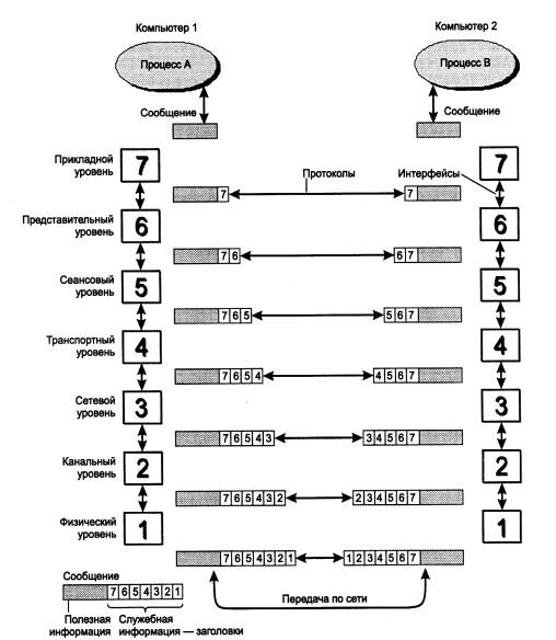 Рис. 1.24. Пример многоуровневого взаимодействия предприятий 1.3.2. Модель OSIИз того, что протокол является соглашением, принятым двумя взаимодействующими объектами, в данном случае двумя работающими в сети компьютерами, совсем не следует, что он обязательно является стандартным. Но на практике при реализации сетей стремятся использовать стандартные протоколы. Это могут быть фирменные, национальные или международные стандарты. В начале 80-х годов ряд международных организаций по стандартизации - ISO, ITU-T и некоторые другие - разработали модель, которая сыграла значительную роль в развитии сетей. Эта модель называется моделью взаимодействия открытых систем (Open System Interconnection, OSI) или моделью OSI. Модель OSI определяет различные уровни взаимодействия систем, дает им стандартные имена и указывает, какие функции должен выполнять каждый уровень. Модель OSI была разработана на основании большого опыта, полученного при создании компьютерных сетей, в основном глобальных, в 70-е годы. Полное описание этой модели занимает более 1000 страниц текста. В модели OSI (рис. 1.25) средства взаимодействия делятся на семь уровней: прикладной, представительный, сеансовый, транспортный, сетевой, канальный и физический. Каждый уровень имеет дело с одним определенным аспектом взаимодействия сетевых устройств.