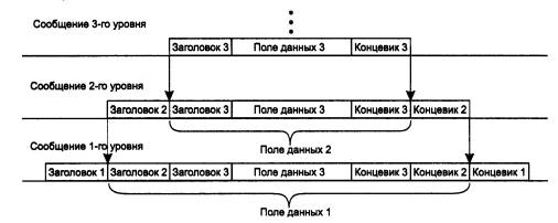 Рис. 1.25. Модель взаимодействия открытых систем ISO/OSI Модель OSI описывает только системные средства взаимодействия, реализуемые операционной системой, системными утилитами, системными аппаратными средствами. Модель не включает средства взаимодействия приложений конечных пользователей. Свои собственные протоколы взаимодействия приложения реализуют, обращаясь к системным средствам. Поэтому необходимо различать уровень взаимодействия приложений и прикладной уровень. Следует также иметь в виду, что приложение может взять на себя функции некоторых верхних уровней модели OSI. Например, некоторые СУБД имеют встроенные средства удаленного доступа к файлам. В этом случае приложение, выполняя доступ к удаленным ресурсам, не использует системную файловую службу; оно обходит верхние уровни модели OSI и обращается напрямую к системным средствам, ответственным за транспортировку сообщений по сети, которые располагаются на нижних уровнях модели OSI. Итак, пусть приложение обращается с запросом к прикладному уровню, например к файловой службе. На основании этого запроса программное обеспечение прикладного уровня формирует сообщение стандартного формата. Обычное сообщение состоит из заголовка и поля данных. Заголовок содержит служебную информацию, которую необходимо передать через сеть прикладному уровню машины-адресата, чтобы сообщить ему, какую работу надо выполнить. В нашем случае заголовок, очевидно, должен содержать информацию о месте нахождения файла и о типе операции, которую необходимо над ним выполнить. Поле данных сообщения может быть пустым или содержать какие-либо данные, например те, которые необходимо записать в удаленный файл. Но для того чтобы доставить эту информацию по назначению, предстоит решить еще много задач, ответственность за которые несут нижележащие уровни. После формирования сообщения прикладной уровень направляет его вниз по стеку представительному уровню. Протокол представительного уровня на основании информации, полученной из заголовка прикладного уровня, выполняет требуемые действия и добавляет к сообщению собственную служебную информацию - заголовок представительного уровня, в котором содержатся указания для протокола представительного уровня машины-адресата. Полученное в результате сообщение передается вниз сеансовому уровню, который в свою очередь добавляет свой заголовок, и т. д. (Некоторые реализации протоколов помещают служебную информацию не только в начале сообщения в виде заголовка, но и в конце, в виде так называемого «концевика».) Наконец, сообщение достигает нижнего, физического уровня, который собственно и передает его по линиям связи машине-адресату. К этому моменту сообщение «обрастает» заголовками всех уровней (рис. 1.26).
