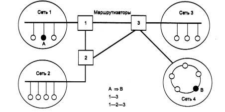 Рис. 1.27. Пример составной сети Проблема выбора наилучшего пути называется маршрутизацией, и ее решение является одной из главных задач сетевого уровня. Эта проблема осложняется тем, что самый короткий путь не всегда самый лучший. Часто критерием при выборе маршрута является время передачи данных по этому маршруту; оно зависит от пропускной способности каналов связи и интенсивности трафика, которая может изменяться с течением времени. Некоторые алгоритмы маршрутизации пытаются приспособиться к изменению нагрузки, в то время как другие принимают решения на основе средних показателей за длительное время. Выбор маршрута может осуществляться и по другим критериям, например надежности передачи. В общем случае функции сетевого уровня шире, чем функции передачи сообщений по связям с нестандартной структурой, которые мы сейчас рассмотрели на примере объединения нескольких локальных сетей. Сетевой уровень решает также задачи согласования разных технологий, упрощения адресации в крупных сетях и создания надежных и гибких барьеров на пути нежелательного трафика между сетями. Сообщения сетевого уровня принято называть пакетами (packets). При организации доставки пакетов на сетевом уровне используется понятие «номер сети». В этом случае адрес получателя состоит из старшей части - номера сети и младшей - номера узла в этой сети. Все узлы одной сети должны иметь одну и ту же старшую часть адреса, поэтому термину «сеть» на сетевом уровне можно дать и другое, более формальное определение: сеть - это совокупность узлов, сетевой адрес которых содержит один и тот же номер сети. На сетевом уровне определяются два вида протоколов. Первый вид - сетевые протоколы (routed protocols) - реализуют продвижение пакетов через сеть. Именно эти протоколы обычно имеют в виду, когда говорят о протоколах сетевого уровня. Однако часто к сетевому уровню относят и другой вид протоколов, называемых протоколами обмена маршрутной информацией или просто протоколами маршрутизации (routing protocols). С помощью этих протоколов маршрутизаторы собирают информацию о топологии межсетевых соединений. Протоколы сетевого уровня реализуются программными модулями операционной системы, а также программными и аппаратными средствами маршрутизаторов. На сетевом уровне работают протоколы еще одного типа, которые отвечают за отображение адреса узла, используемого на сетевом уровне, в локальный адрес сети. Такие протоколы часто называют протоколами разрешения адресов - Address Resolution Protocol, ARP. Иногда их относят не к сетевому уровню, а к канальному, хотя тонкости классификации не изменяют их сути. Примерами протоколов сетевого уровня являются протокол межсетевого взаимодействия IP стека TCP/IP и протокол межсетевого обмена пакетами IPX стека Novell. Транспортный уровеньНа пути от отправителя к получателю пакеты могут быть искажены или утеряны. Хотя некоторые приложения имеют собственные средства обработки ошибок, существуют и такие, которые предпочитают сразу иметь дело с надежным соединением. Транспортный уровень (Transport layer) обеспечивает приложениям или верхним уровням стека - прикладному и сеансовому - передачу данных с той степенью надежности, которая им требуется. Модель OSI определяет пять классов сервиса, предоставляемых транспортным уровнем. Эти виды сервиса отличаются качеством предост