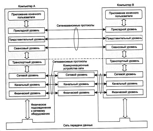 Рис. 1.28. Сетезависимые и сетенезависимые уровни модели OSI