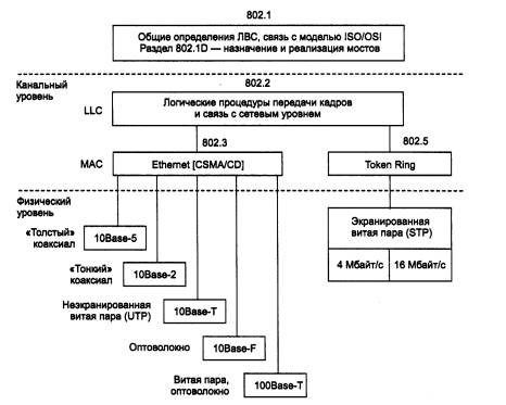 Рис. 3.1. Структура стандартов IEEE 802.X Эта структура появилась в результате большой работы, проведенной комитетом 802 по выделению в разных фирменных технологиях общих подходов и общих функций, а также согласованию стилей их описания. В результате канальный уровень был разделен на два упомянутых подуровня. Описание каждой технологии разделено на две части: описание уровня MAC и описание физического уровня. Как видно из рисунка, практически у каждой технологии единственному протоколу уровня MAC соответствует несколько вариантов протоколов физического уровня (на рисунке в целях экономии места приведены только технологии Ethernet и Token Ring, но все сказанное справедливо также и для остальных технологий, таких как ArcNet, FDDI, l00VG-AnyLAN). Над канальным уровнем всех технологий изображен общий для них протокол LLC, поддерживающий несколько режимов работы, но независимый от выбора конкретной технологии. Стандарт LLC курирует подкомитет 802.2. Даже технологии, стандартизованные не в рамках комитета 802, ориентируются на использование протокола LLC, определенного стандартом 802.2, например протокол FDDI, стандартизованный ANSI. Особняком стоят стандарты, разрабатываемые подкомитетом 802.1. Эти стандарты носят общий для всех технологий характер. В подкомитете 802.1 были разработаны общие определения локальных сетей и их свойств, определена связь трех уровней модели IEEE 802 с моделью OSI. Но наиболее практически важными являются стандарты 802.1, которые описывают взаимодействие между собой различных технологий, а также стандарты по построению более сложных сетей на основе базовых топологий. Эта группа стандартов носит общее название стандартов межсетевого взаимодействия (internetworking). Сюда входят такие важные стандарты, как стандарт 802. ID, описывающий логику работы моста/коммутатора, стандарт 802.1Н, определяющий работу транслирующего моста, который может без маршрутизатора объединять сети Ethernet и FDDI, Ethernet и Token Ring и т. п. Сегодня набор стандартов, разработанных подкомитетом 802.1, продолжает расти. Например, недавно он пополнился важным стандартом 802.1Q, определяющим способ построения виртуальных локальных сетей VLAN в сетях на основе коммутаторов. Стандарты 802.3,802.4,802.5 и 802.12 описывают технологии локальных сетей, которые появились в результате улучшений фирменных технологий, легших в их основу. Так, основу стандарта 802.3 составила технология Ethernet, разработанная компаниями Digital, Intel и Xerox (или Ethernet DIX), стандарт 802.4 появился | как обобщение технологии ArcNet компании Datapoint Corporation, а стандарт 802.5 в основном соответствует технологии Token Ring компании IBM. Исходные фирменные технологии и их модифицированные варианты - стандарты 802.х в ряде случаев долгие годы существовали параллельно. Например, технология ArcNet так до конца не была приведена в соответствие со стандартом 802.4 (теперь это делать поздно, так как где-то примерно с 1993 года производство оборудования ArcNet было свернуто). Расхождения между технологией Token Ring и стандартом 802.5 тоже периодически возникают, так как компания IBM регулярно вносит усовершенствования в свою технологию и комитет 802.5 отражает эти усовершенствования в стандарте с некоторым запозданием. Исключение составляет технология Ethernet. Последний фирменный стандарт Ethernet DIX был принят в 1980 году, и с тех пор никто больше не предпринимал попыток фирменного развития Ethernet. Все новшества 