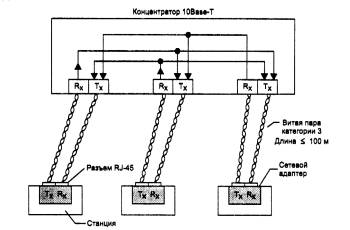 Рис. 3.9. Сеть стандарта 10Base-2 Реализация этого стандарта на практике приводит к наиболее простому решению для кабельной сети, так как для соединения компьютеров требуются только сетевые адаптеры, Т-коннекторы и терминаторы 50 Ом. Однако этот вид кабельных соединений наиболее сильно подвержен авариям и сбоям: кабель более восприимчив к помехам, чем «толстый» коаксиал, в моноканале имеется большое количество механических соединений (каждый Т-коннектор дает три механических соединения, два из которых имеют жизненно важное значение для всей сети), пользователи имеют доступ к разъемам и могут нарушить целостность моноканала. Кроме того, эстетика и эргономичность этого решения оставляют желать лучшего, так как от каждой станции через Т-коннектор отходят два довольно заметных провода, которые под столом часто образуют моток кабеля - запас, необходимый на случай даже небольшого перемещения рабочего места. Общим недостатком стандартов 10Base-5 и 10Base-2 является отсутствие оперативной информации о состоянии моноканала. Повреждение кабеля обнаруживается сразу же (сеть перестает работать), но для поиска отказавшего отрезка кабеля необходим специальный прибор - кабельный тестер. Стандарт 10Bаse-TСтандарт принят в 1991 году, как дополнение к существующему набору стандартов Ethernet, и имеет обозначение 802.3L Сети 10Base-T используют в качестве среды две неэкранированные витые пары (Unshielded Twisted Pair, UTP). Многопарный кабель на основе неэкранированной витой пары категории 3 (категория определяет полосу пропускания кабеля, величину перекрестных наводок NEXT и некоторые другие параметры его качества) телефонные компании уже достаточно давно использовали для подключения телефонных аппаратов внутри зданий. Этот кабель носит также название Voice Grade, говорящее о том, что он предназначен для передачи голоса. Идея приспособить этот популярный вид кабеля для построения локальных сетей оказалась очень плодотворной, так как многие здания уже были оснащены нужной кабельной системой. Оставалось разработать способ подключения сетевых адаптеров и прочего коммуникационного оборудования к витой паре таким образом, чтобы изменения в сетевых адаптерах и программном обеспечении сетевых операционных систем были бы минимальными по сравнению с сетями Ethernet на коаксиале. Это удалось, поэтому переход на витую пару требует только замены трансивера сетевого адаптера или порта маршрутизатора, а метод доступа и все протоколы канального уровня остались теми же, что и в сетях Ethernet на коаксиале. Конечные узлы соединяются по топологии «точка-точка» со специальным устройством - многопортовым повторителем с помощью двух витых пар. Одна витая пара требуется для передачи данных от станции к повторителю (выход Тх сетевого адаптера), а другая - для передачи данных от повторителя к станции (вход Rх сетевого адаптера). На рис. 3.10 показан пример трехпортового повторителя. Повторитель принимает сигналы от одного из конечных узлов и синхронно передает их на все свои остальные порты, кроме того, с которого поступили сигналы.