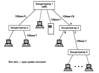 Рис. 3.10. Сеть стандарта 10Bаse-T: Тх - передатчик; Rх - приемник Многопортовые повторители в данном случае обычно называются концентраторами (англоязычные термины - hub или concentrator). Концентратор осуществляет функции повторителя сигналов на всех отрезках витых пар, подключенных к его портам, так что образуется единая среда передачи данных - логический моноканал (логическая общая шина). Повторитель обнаруживает коллизию в сегменте в случае одновременной передачи сигналов по нескольким своим Rх -входам и посылает jam-последовательность на все свои Тх - выходы. Стандарт определяет битовую скорость передачи данных 10 Мбит/с и максимальное расстояние отрезка витой пары между двумя непосредственно связанными узлами (станциями и концентраторами) не более 100 м при наличии витой пары качества не ниже категории 3. Это расстояние определяется полосой пропускания витой пары - на длине 100 м она позволяет передавать данные со скоростью 10 Мбит/с при использовании манчестерского кода. Концентраторы 10Base-T можно соединять друг с другом с помощью тех же портов, которые предназначены для подключения конечных узлов. При этом нужно позаботиться о том, чтобы передатчик и приемник одного порта были соединены соответственно с приемником и передатчиком другого порта. Для обеспечения синхронизации станций при реализации процедур доступа CSMA/CD и надежного распознавания станциями коллизий в стандарте определено максимально число концентраторов между любыми двумя станциями сети, а именно 4. Это правило носит название «правила 4-х хабов» и оно заменяет «правило 5-4-3», применяемое к коаксиальным сетям. При создании сети 10Base-T с большим числом станций концентраторы можно соединять друг с другом иерархическим способом, образуя древовидную структуру (рис. 3.11).