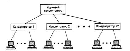 Рис. 3.11. Иерархическое соединение концентраторов Ethernet ВНИМАНИЕ Петлевидное соединение концентраторов в стандарте 10Ваsе-Т запрещено, так как оно приводит к некорректной работе сети. Это требование означает, что в сети 10Вазе-Т не разрешается создавать параллельные каналы связи между критически важными концентраторами для резервирования связей на случай отказа порта, концентратора или кабеля, Резервирование связей возможно только за счет перевода одной из параллельных связей в неактивное (заблокированное) состояние. Общее количество станций в сети 10Base-T не должно превышать общего предела в 1024, и для данного типа физического уровня это количество действительно можно достичь. Для этого достаточно создать двухуровневую иерархию концентраторов, расположив на нижнем уровне достаточное количество концентраторов с общим количеством портов 1024 (рис. 3.12). Конечные узлы нужно подключить к портам концентраторов нижнего уровня. Правило 4-х хабов при этом выполняется - между любыми конечными узлами будет ровно 3 концентратора.