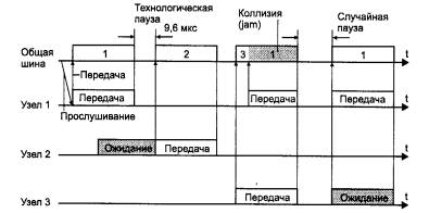 Рис. 3.3. Метод случайного доступа CSMA/CD Этапы доступа к средеВсе данные, передаваемые по сети, помещаются в кадры определенной структуры и снабжаются уникальным адресом станции назначения. Чтобы получить возможность передавать кадр, станция должна убедиться, что разделяемая среда свободна. Это достигается прослушиванием основной гармоники сигнала, которая также называется несущей частотой (carrier-sense, CS). Признаком незанятости среды является отсутствие на ней несущей частоты, которая при манчестерском способе кодирования равна 5-10 МГц, в зависимости от последовательности единиц и нулей, передаваемых в данный момент. Если среда свободна, то узел имеет право начать передачу кадра. Этот кадр изображен на рис. 3.3 первым. Узел 1 обнаружил, что среда свободна, и начал передавать свой кадр. В классической сети Ethernet на коаксиальном кабеле сигналы передатчика узла 1 распространяются в обе стороны, так что все узлы сети их получают. Кадр данных всегда сопровождается преамбулой (preamble), которая состоит из 7 байт, состоящих из значений 10101010, и 8-го байта, равного 10101011. Преамбула нужна для вхождения приемника в побитовый и побайтовый синхронизм с передатчиком. Все станции, подключенные к кабелю, могут распознать факт передачи кадра, и та станция, которая узнает собственный адрес в заголовках кадра, записывает его содержимое в свой внутренний буфер, обрабатывает полученные данные, передает их вверх по своему стеку, а затем посылает по кабелю кадр-ответ. Адрес станции источника содержится в исходном кадре, поэтому станция-получатель знает, кому нужно послать ответ. Узел 2 во время передачи кадра узлом 1 также пытался начать передачу своего кадра, однако обнаружил, что среда занята - на ней присутствует несущая частота, - поэтому узел 2 вынужден ждать, пока узел 1 не прекратит передачу кадра. После окончания передачи кадра все узлы сети обязаны выдержать технологическую паузу (Inter Packet Gap) в 9,6 мкс. Эта пауза, называемая также межкадровым интервалом, нужна для приведения сетевых адаптеров в исходное состояние, а также для предотвращения монопольного захвата среды одной станцией. После окончания технологической паузы узлы имеют право начать передачу своего кадра, так как среда свободна. Из-за задержек распространения сигнала по кабелю не все узлы строго одновременно фиксируют факт окончания передачи кадра узлом 1. В приведенном примере узел 2 дождался окончания передачи кадра узлом 1, сделал паузу в 9,6 мкс и начал передачу своего кадра. Возникновение коллизииПри описанном подходе возможна ситуация, когда две станции одновременно пытаются передать кадр данных по общей среде. Механизм прослушивания среды и пауза между кадрами не гарантируют от возникновения такой ситуации, когда две или более станции одновременно решают, что среда свободна, и начинают передавать свои кадры. Говорят, что при этом происходит коллизия (collision), так как содержимое обоих кадров сталкивается на общем кабеле и происходит искажение информации - методы кодирования, используемые в Ethernet, не позволяют выделять сигналы каждой станции из общего сигнала. ПРИМЕЧАНИЕ Заметим, что этот факт отражен в составляющей «Base(band)», присутствующей в названиях всех физических протоколов технологии Ethernet (например, 10Base-2,10Base-T и т. п.). Baseband network означает сеть с немодулированной передачей, в которой соо