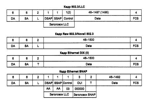 Форматы всех этих четырех типов кадров Ethernet приведены на рис. 3.6.