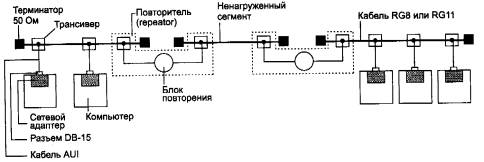 Число 10 в указанных выше названиях обозначает битовую скорость передачи данных этих стандартов - 10 Мбит/с, а слово Base - метод передачи на одной базовой частоте 10 МГц (в отличие от методов, использующих несколько несущих частот, которые называются Broadband - широкополосными). Последний символ в названии стандарта физического уровня обозначает тип кабеля. Стандарт 10Base-5Стандарт IOBase-5 в основном соответствует экспериментальной сети Ethernet фирмы Xerox и может считаться классическим Ethernet. Он использует в качестве среды передачи данных коаксиальный кабель с волновым сопротивлением 50 Ом, диаметром центрального медного провода 2,17 мм и внешним диаметром около 10 мм («толстый» Ethernet). Такими характеристиками обладают кабели марок RG-SHRG-ll. Различные компоненты сети, состоящей из трех сегментов, соединенных повторителями, выполненной на толстом коаксиале, показаны на рис. 3.7.