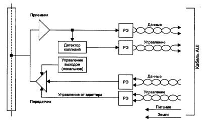 Рис. 3.8. Структурная схема трансивера Детектор коллизий определяет наличие коллизии в коаксиальном кабеле по повышенному уровню постоянной составляющей сигналов. Если постоянная составляющая превышает определенный порог (около 1,5 В), значит, на кабель работает более одного передатчика. Развязывающие элементы (РЭ) обеспечивают гальваническую развязку трансивера от остальной части сетевого адаптера и тем самым защищают адаптер и компьютер от значительных перепадов напряжения, возникающих на кабеле при его повреждении. Стандарт l0Base-5 определяет возможность использования в сети специального устройства - повторителя (repeator). Повторитель служит для объединения в одну сеть нескольких сегментов кабеля и увеличения тем самым общей длины сети. Повторитель принимает сигналы из одного сегмента кабеля и побитно синхронно повторяет их в другом сегменте, улучшая форму и мощность импульсов, а также синхронизируя импульсы. Повторитель состоит из двух (или нескольких) трансиверов, которые присоединяются к сегментам кабеля, а также блока повторения со своим тактовым генератором. Для лучшей синхроннизации передаваемых бит повторитель задерживает передачу нескольких первых бит преамбулы кадра, за счет чего увеличивается задержка передачи кадра с сегмента на сегмент, а также несколько уменьшается межкадровый интервал IPG. Стандарт разрешает использование в сети не более 4 повторителей и, соответственно, не более 5 сегментов кабеля. При максимальной длине сегмента кабеля в 500 м это дает максимальную длину сети l0Base-5 в 2500 м. Только 3 сегмента из 5 могут быть нагруженными, то есть такими, к которым подключаются конечные узлы. Между нагруженными сегментами должны быть ненагруженные сегменты, так что максимальная конфигурация сети представляет собой два нагруженных крайних сегмента, которые соединяются ненагруженными сегментами еще с одним центральным нагруженным сегментом. На рис. 3.7 был приведен пример сети Ethernet, состоящей из трех сегментов, объединенных двумя повторителями. Крайние сегменты являются нагруженными, а промежуточный - ненагруженным. Правило применения повторителей в сети Ethernet l0Base-5 носит название «правило 5-4-Зу. 5 сегментов, 4 повторителя, 3 нагруженных сегмента. Ограниченное число повторителей объясняется дополнительными задержками распространения сигнала, которые они вносят. Применение повторителей увеличивает время двойного распространения сигнала, которое для надежного распознавания коллизий не должно превышать время передачи кадра минимальной длины, то есть кадра в 72 байт или 576 бит. Каждый повторитель подключается к сегменту одним своим трансивером, поэтому к нагруженным сегментам можно подключить не более 99 узлов. Максимальное число конечных узлов в сети l0Base-5 таким образом составляет 99*3 = 297 узлов. К достоинствам стандарта 10Base-5 относятся: