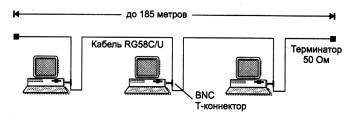 Стандарт 10Base-2Стандарт 10Base-2 использует в качестве передающей среды коаксиальный кабель с диаметром центрального медного провода 0,89 мм и внешним диаметром около 5 мм («тонкий» Ethernet). Кабель имеет волновое сопротивление 50 Ом. Такими характеристиками обладают кабели марок RG-58 /U, RG-58 A/U, RG-58 C/U. Максимальная длина сегмента без повторителей составляет 185 м, сегмент должен иметь на концах согласующие терминаторы 50 Ом. Тонкий коаксиальный кабель дешевле толстого, из-за чего сети l0Base-2 иногда называют сетями Cheapemet (от cheaper - более дешевый). Но за дешевизну кабеля приходится расплачиваться качеством - «тонкий» коаксиал обладает худшей помехозащищенностью, худшей механической прочностью и более узкой полосой пропускания. Станции подключаются к кабелю с помощью высокочастотного BNC Т-коннектора, который представляет собой тройник, один отвод которого соединяется с сетевым адаптером, а два других - с двумя концами разрыва кабеля. Максимальное количество станций, подключаемых к одному сегменту, - 30. Минимальное расстояние между станциями -1м. Кабель «тонкого» коаксиала имеет разметку для подключения узлов с шагом в 1 м. Стандарт l0Base-2 также предусматривает использование повторителей, применение которых также должно соответствовать «правилу 5-4-3». В этом случае сеть будет иметь максимальную длину в 5х185 = 925 м. Очевидно, что это ограничение является более сильным, чем общее ограничение в 2500 метров. ВНИМАНИЕ Для построения корректной сети Ethernet нужно соблюсти много ограничений, причем некоторые из них относятся к одним и тем же параметрам сети - например, максимальная длина или максимальное количество компьютеров в сети должны удовлетворять одновременно нескольким разным условиям. Корректная сеть Ethernet должна соответствовать всем требованиям, но на практике нужно удовлетворить только наиболее жесткие. Так, если в сети Ethernet-не должно быть более 1024 узлов, а стандарт 10Base-2 ограничивает число нагруженных сегментов тремя, то общее количество узлов в сети lOBase-2 не должно превышать 29*3 = 87. Менее жесткое ограничение в 1024 конечных узла в сети 10Base-2 никогда не достигается. Стандарт 10Base-2 очень близок к стандарту 10Base-5. Но трансиверы в нем объединены с сетевыми адаптерами за счет того, что более гибкий тонкий коаксиальный кабель может быть подведен непосредственно к выходному разъему платы сетевого адаптера, установленной в шасси компьютера. Кабель в данном случае «висит» на сетевом адаптере, что затрудняет физическое перемещение компьютеров. Типичный состав сети стандарта 10Base-2, состоящей из одного сегмента кабеля, показан на рис. 3.9.