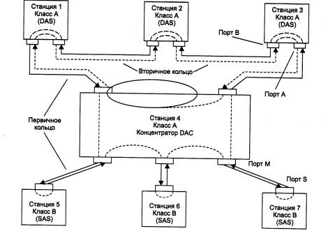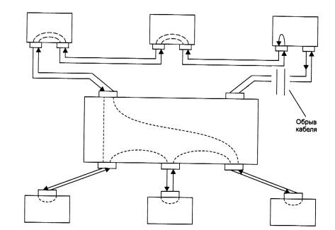 Рис. 3.18. Подключение узлов к кольцам FDDI В случае однократного обрыва кабеля между устройствами с двойным подключением сеть FDDI сможет продолжить нормальную работу за счет автоматической реконфигурации внутренних путей передачи кадров между портами концентратора (рис. 3.19). Двукратный обрыв кабеля приведет к образованию двух изолированных сетей FDDI. При обрыве кабеля, идущего к станции с одиночным подключением, она становится отрезанной от сети, а кольцо продолжает работать за счет реконфигурации внутреннего пути в концентраторе - порт М, к которому была подключена данная станция, будет исключен из общего пути.