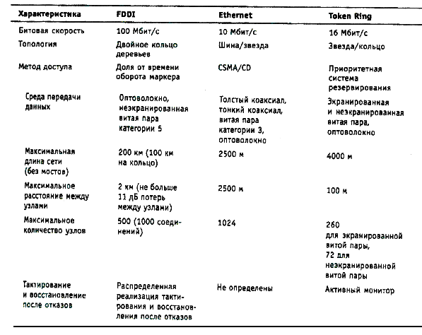 Подуровень TP-PMD определяет возможность передачи данных между станциями по витой паре в соответствии с методом физического кодирования MLT-3, использующего два уровня потенциала: +V и -V для представления данных в кабеле. Для получения равномерного по мощности спектра сигнала данные перед физическим кодированием проходят через скрэмблер. Максимальное расстояние между узлами в соответствии со стандартом TP-PMD равно 100 м. Максимальная общая длина кольца FDDI составляет 100 километров, максимальное число станций с двойным подключением в кольце - 500. 3.5.5. Сравнение FDDI с технологиями Ethernet и Token RingВ табл. 3.7 представлены результаты сравнения технологии FDDI с технологиями Ethernet и Token Ring. Таблица 3.7. Характеристики технологий FDDI, Ethernet, Token Ring