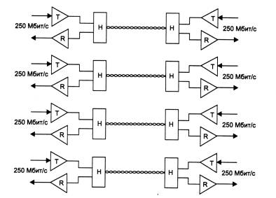 Рис. 3.26. Двунаправленная передача по четырем парам DTP категории 5 Для отделения принимаемого сигнала от своего собственного приемник вычитает из результирующего сигнала известный ему свой сигнал. Естественно, что это не простая операция и для ее выполнения используются специальные цифровые сигнальные процессоры - DSP (Digital Signal Processor). Такая техника уже прошла проверку практикой, но в модемах и сетях ISDN она применялась совсем на других скоростях. При полудуплексном режиме работы получение встречного потока данных считается коллизией, а для полнодуплексного режима работы - нормальной ситуацией. Ввиду того что работы по стандартизации спецификации Gigabit Ethernet на неэкранированной витой паре категории 5 подходят к концу, многие производители и потребители надеются на положительный исход этой работы, так как в этом случае для поддержки технологии Gigabit Ethernet не нужно будет заменять уже установленную проводку категории 5 на оптоволокно или проводку категории 7. Выводы