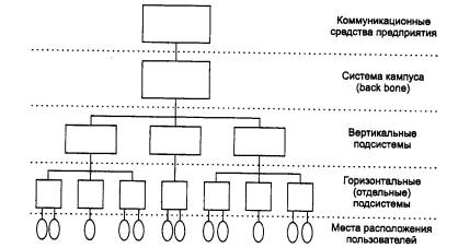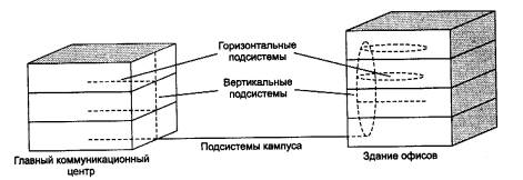Горизонтальная подсистема соединяет кроссовый шкаф этажа с розетками пользователей. Подсистемы этого типа соответствуют этажам здания. Вертикальная подсистема соединяет кроссовые шкафы каждого этажа с центральной аппаратной здания. Следующим шагом иерархии является подсистема кампуса, которая соединяет несколько зданий с главной аппаратной всего кампуса. Эта часть кабельной системы обычно называется магистралью (backbone). Использование структурированной кабельной системы вместо хаотически проложенных кабелей дает предприятию много преимуществ.